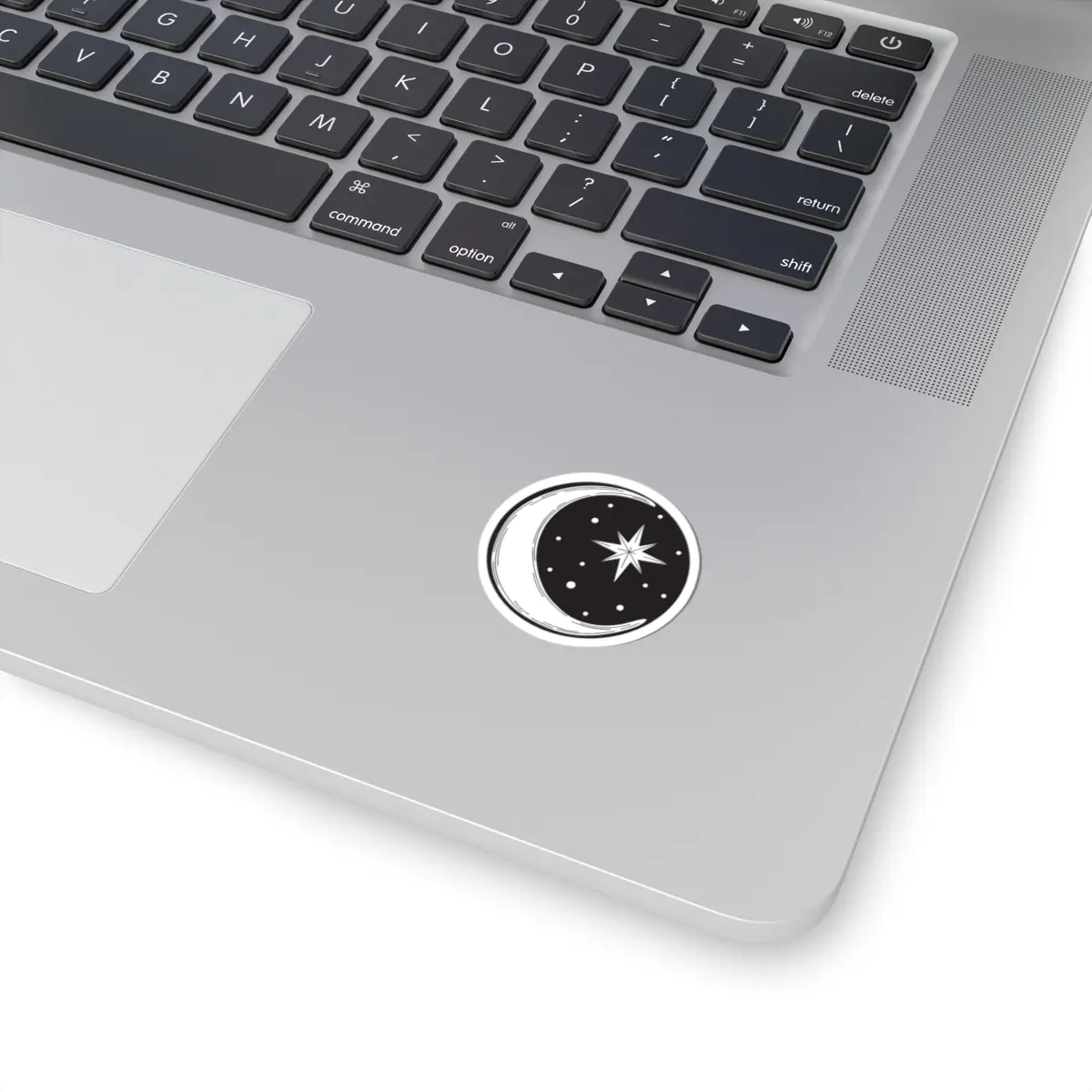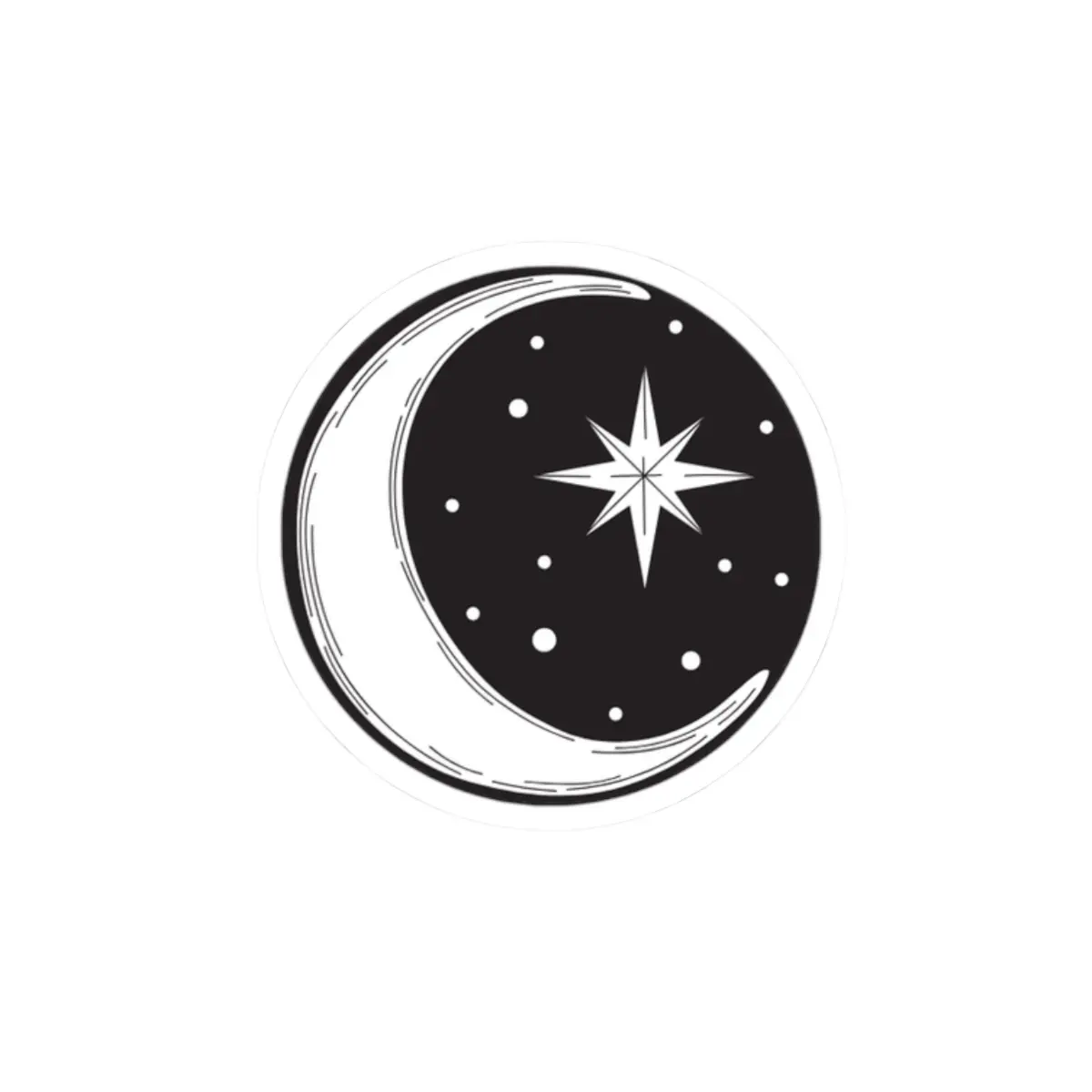 A small, moon-and-star kiss-cut sticker that brings quiet, celestial energy to everyday items. The glossy finish makes the soft grayscale illustration pop against laptops, journals, water bottles, or window panes. It clings smoothly and bubble-free, adding a subtle, moody accent for anyone who loves nighttime aesthetics, stargazing, or minimal occult-inspired decor. Lightweight and durable, it wears well on indoor surfaces and blends with both white and transparent backgrounds for a tidy, polished look.