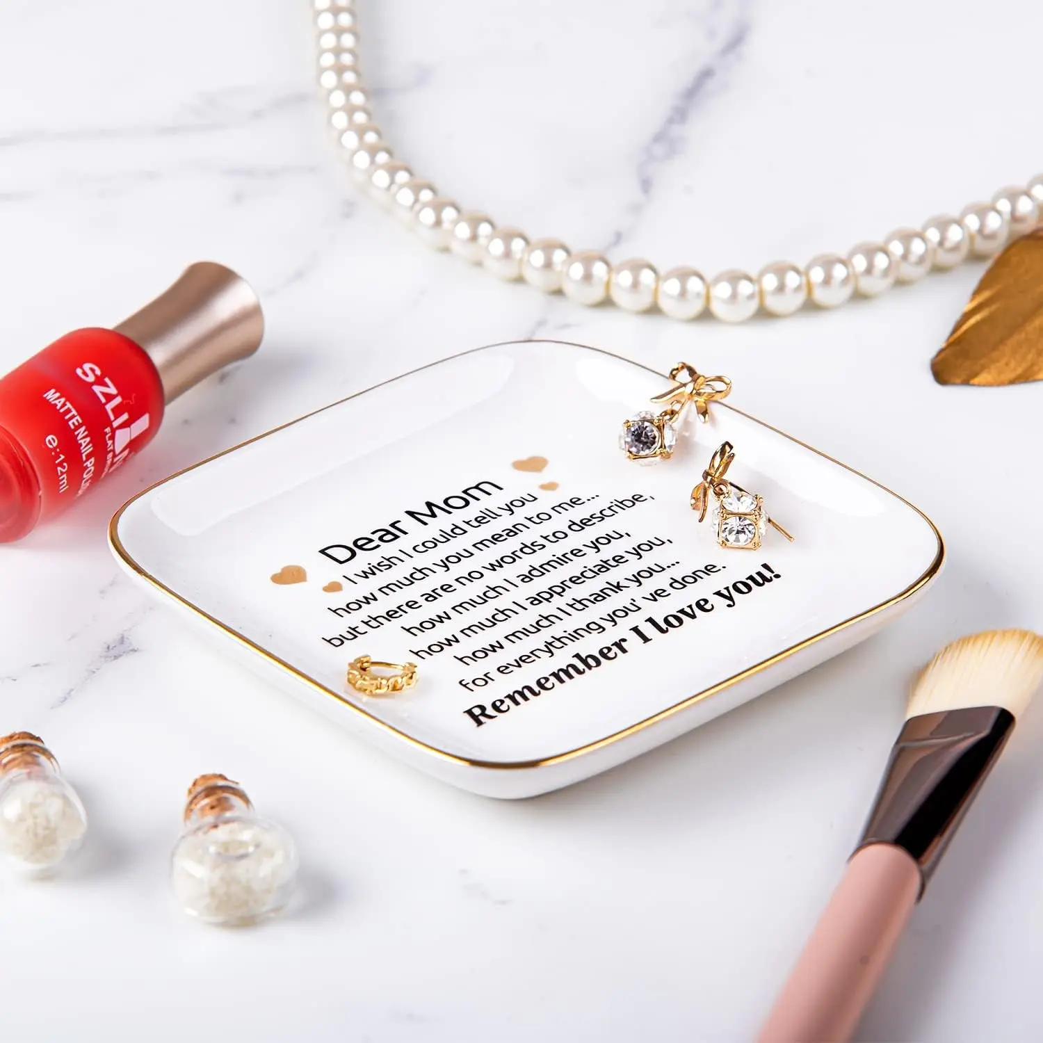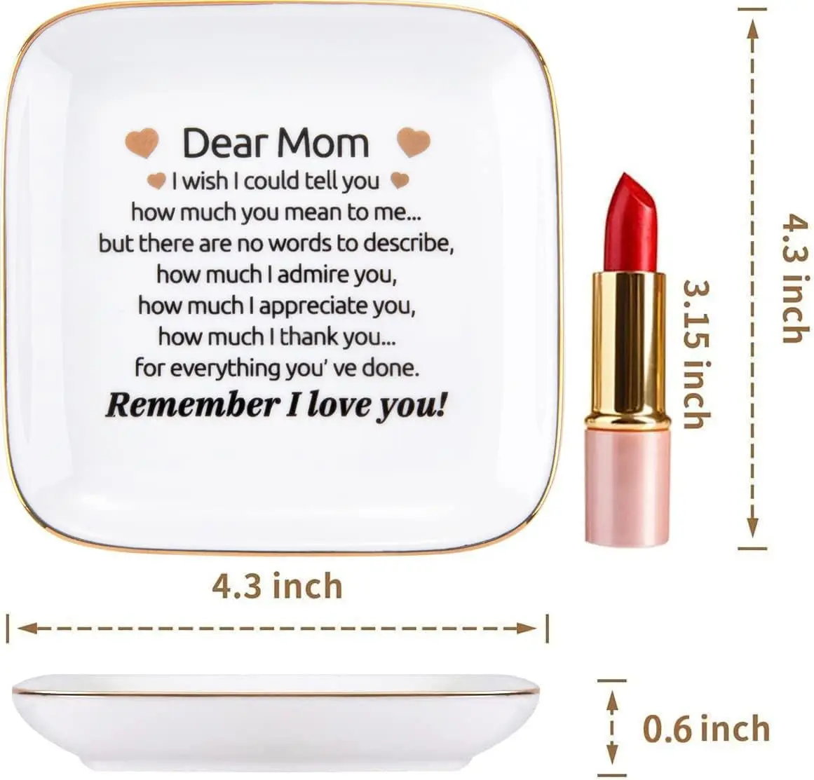 The dish is made from glazed ceramic material and features a printed sentiment design reading “Remember I Love You Mom.” It is suitable for everyday decorative and organizational use in home environments.
