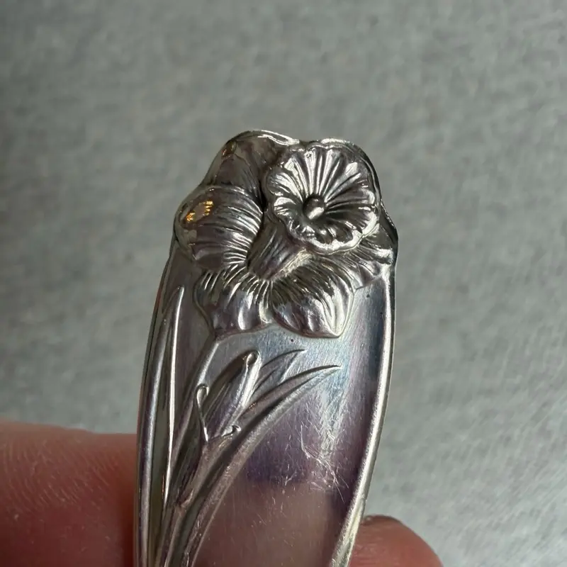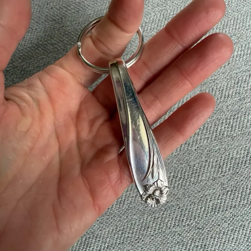 Handmade key chain made by me from vintage silver plated fork in pattern Daffodil! All my pieces are made from flatware found at estate sales, since this is a vintage fork there are imperfections in the metal.