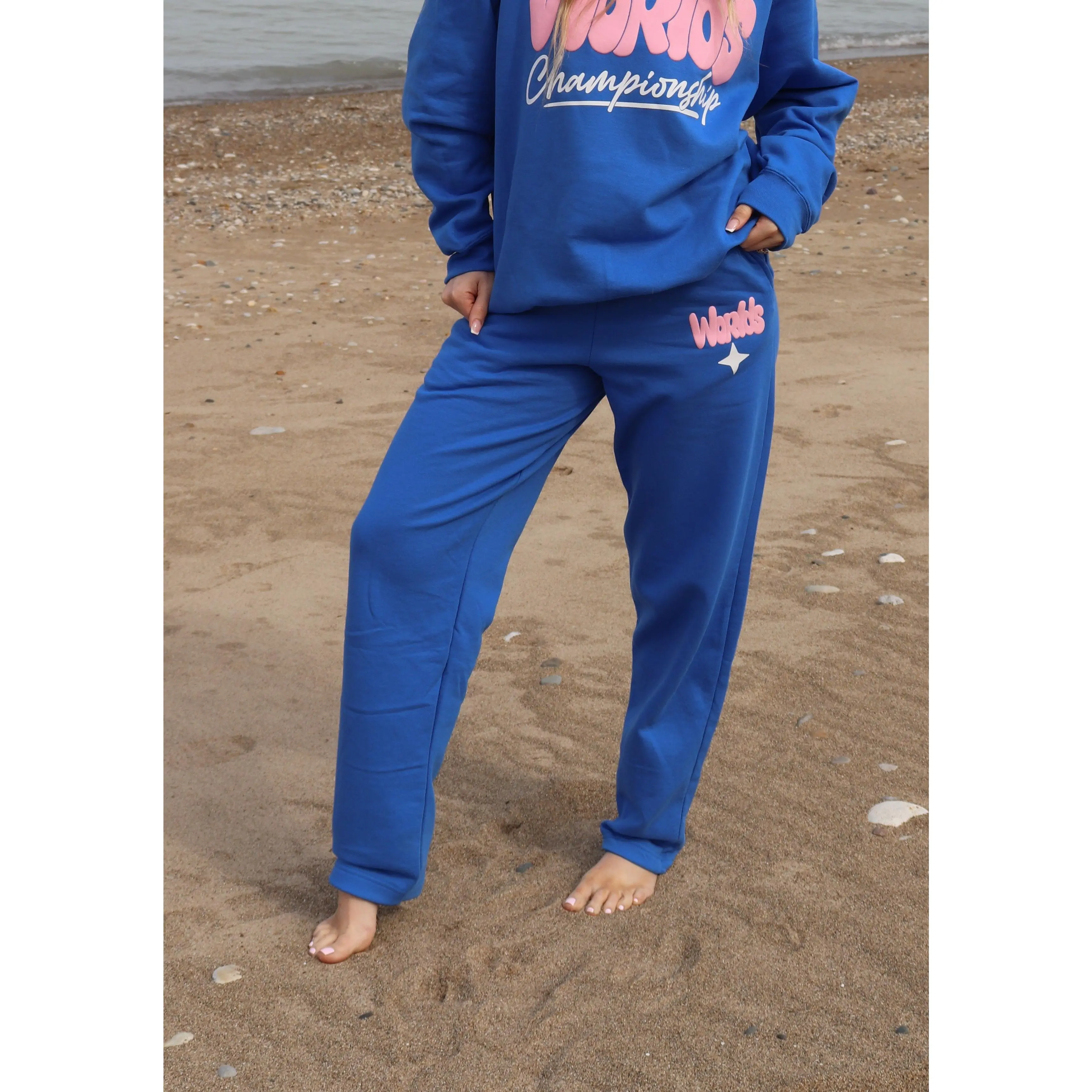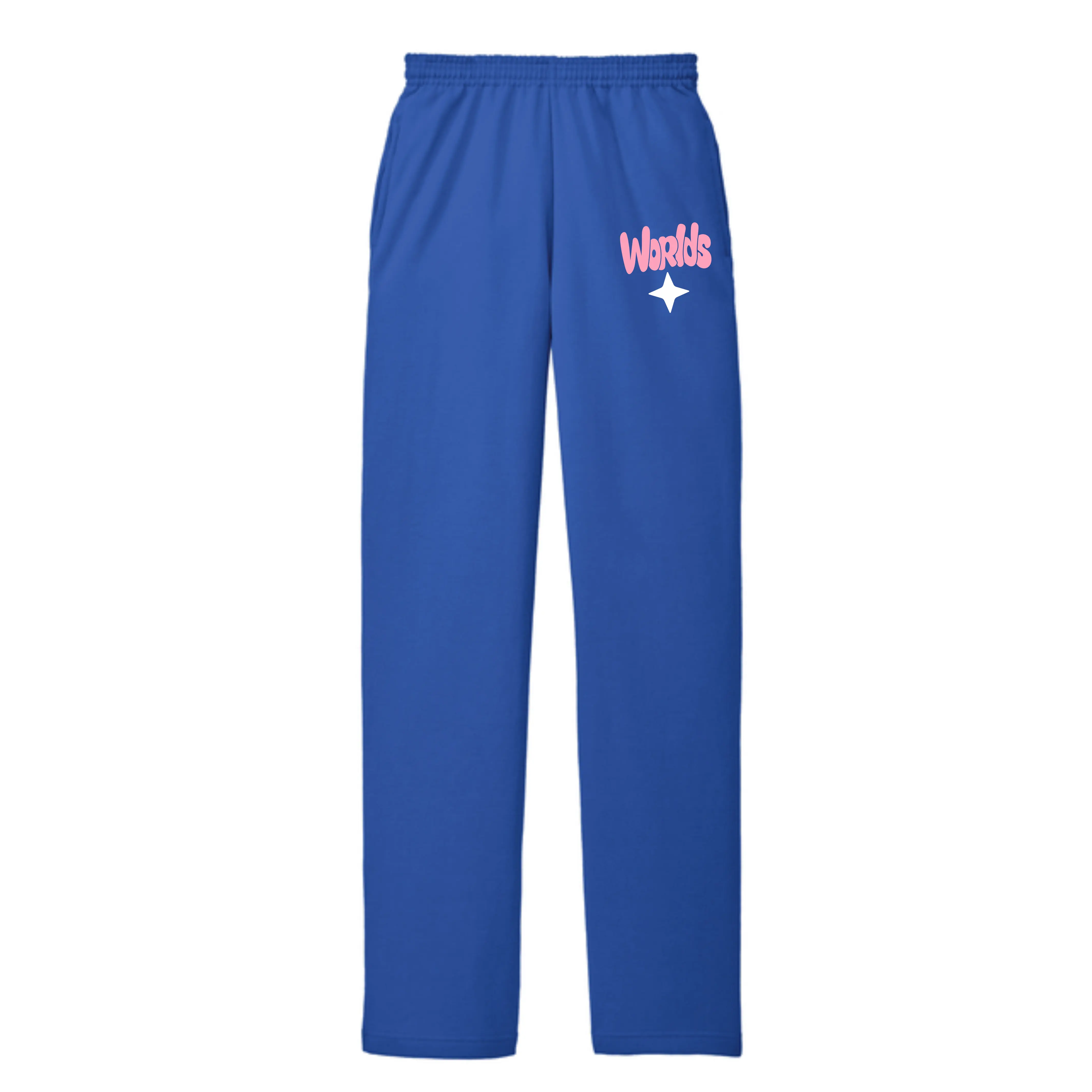 Featuring a clean royal blue base with a puffy “Worlds” graphic in soft pink, these joggers bring the same dimensional detail and style as the matching noodie. Perfect for warmups, travel days, or everyday wear, they’re built to keep you comfortable while repping your Worlds experience.