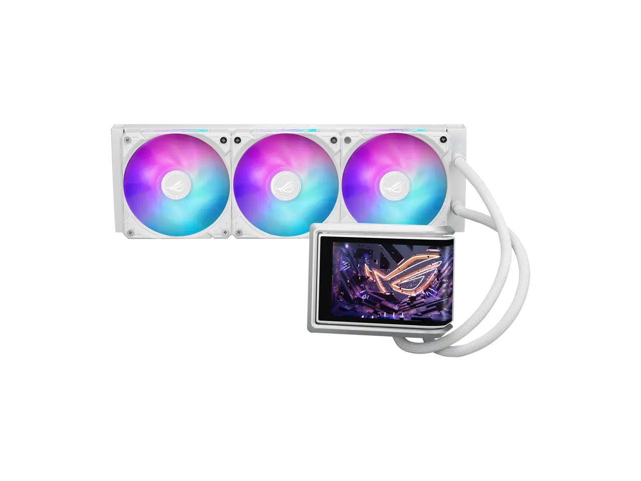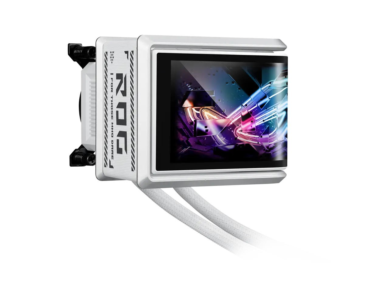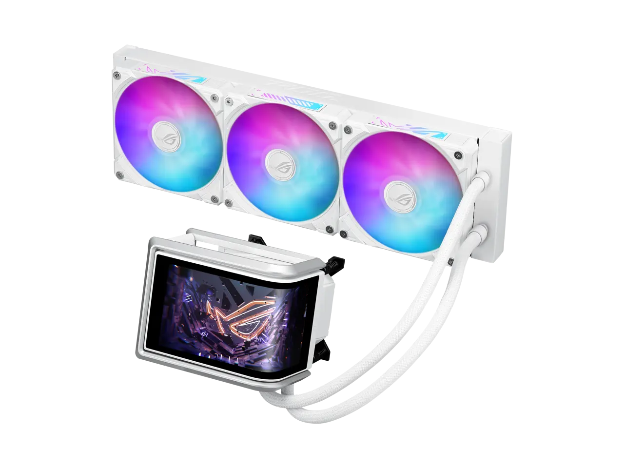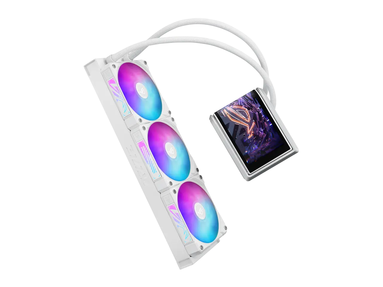 ASUS ROG RYUO IV 360 ARGB White with curved 6.67-inch AMOLED display that supports 3D-effect video or customizable system stats, plus Asetek Emma Gen8 V2 pump and pre-mounted daisy-chained ARGB fans