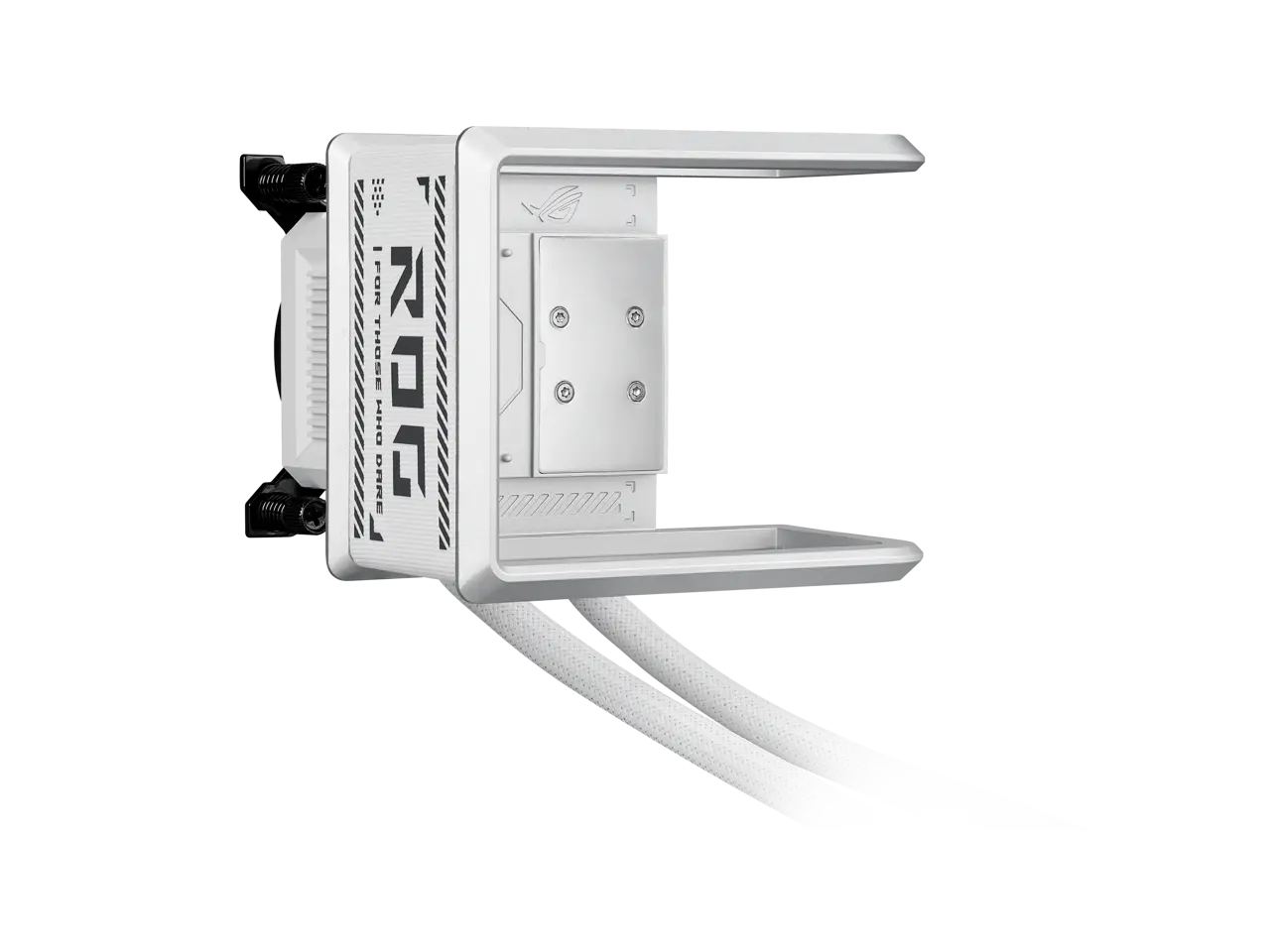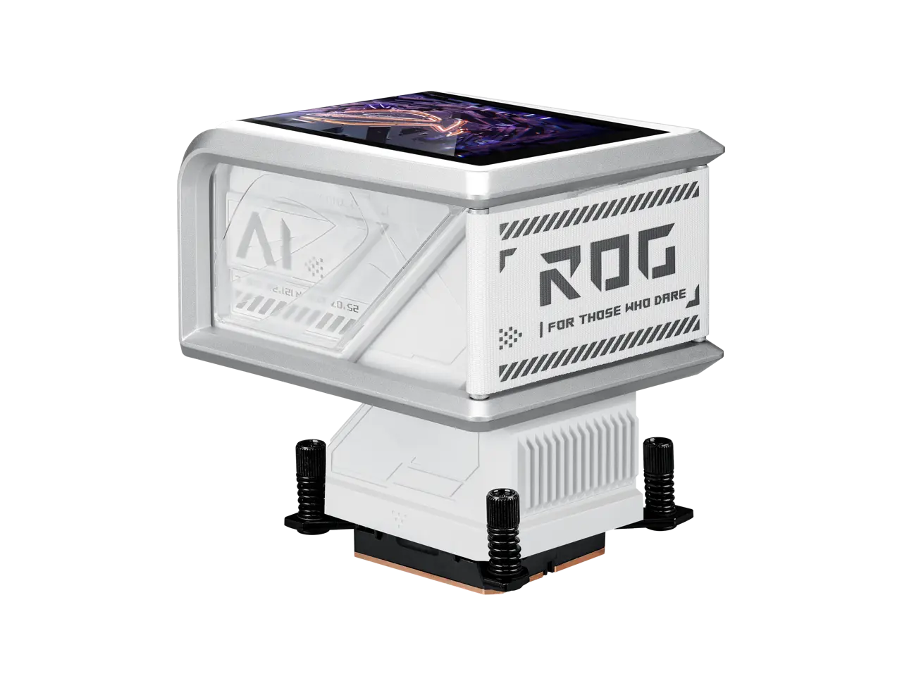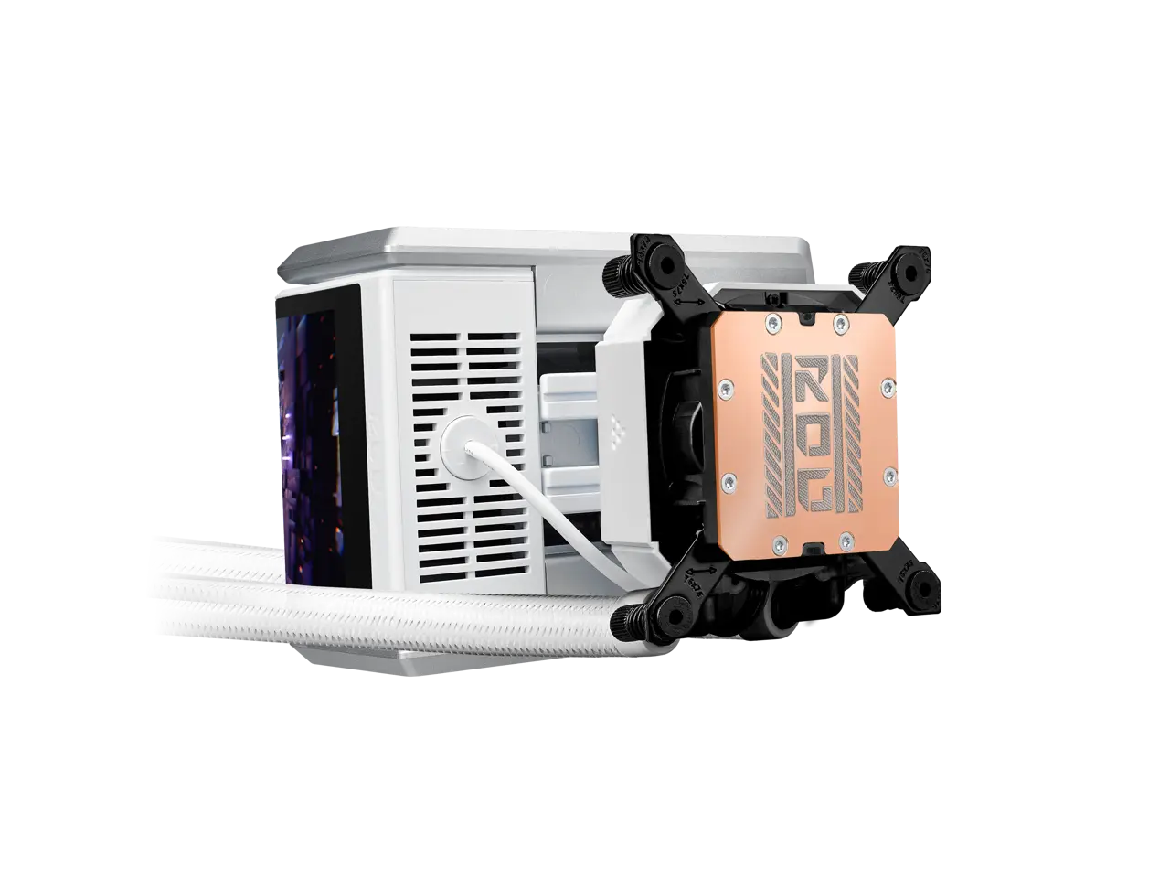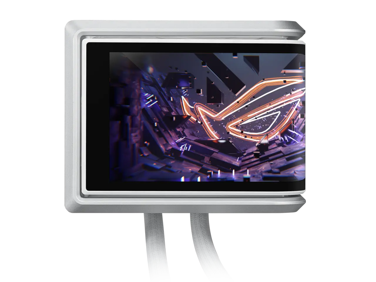 ASUS ROG RYUO IV 360 ARGB White with curved 6.67-inch AMOLED display that supports 3D-effect video or customizable system stats, plus Asetek Emma Gen8 V2 pump and pre-mounted daisy-chained ARGB fans