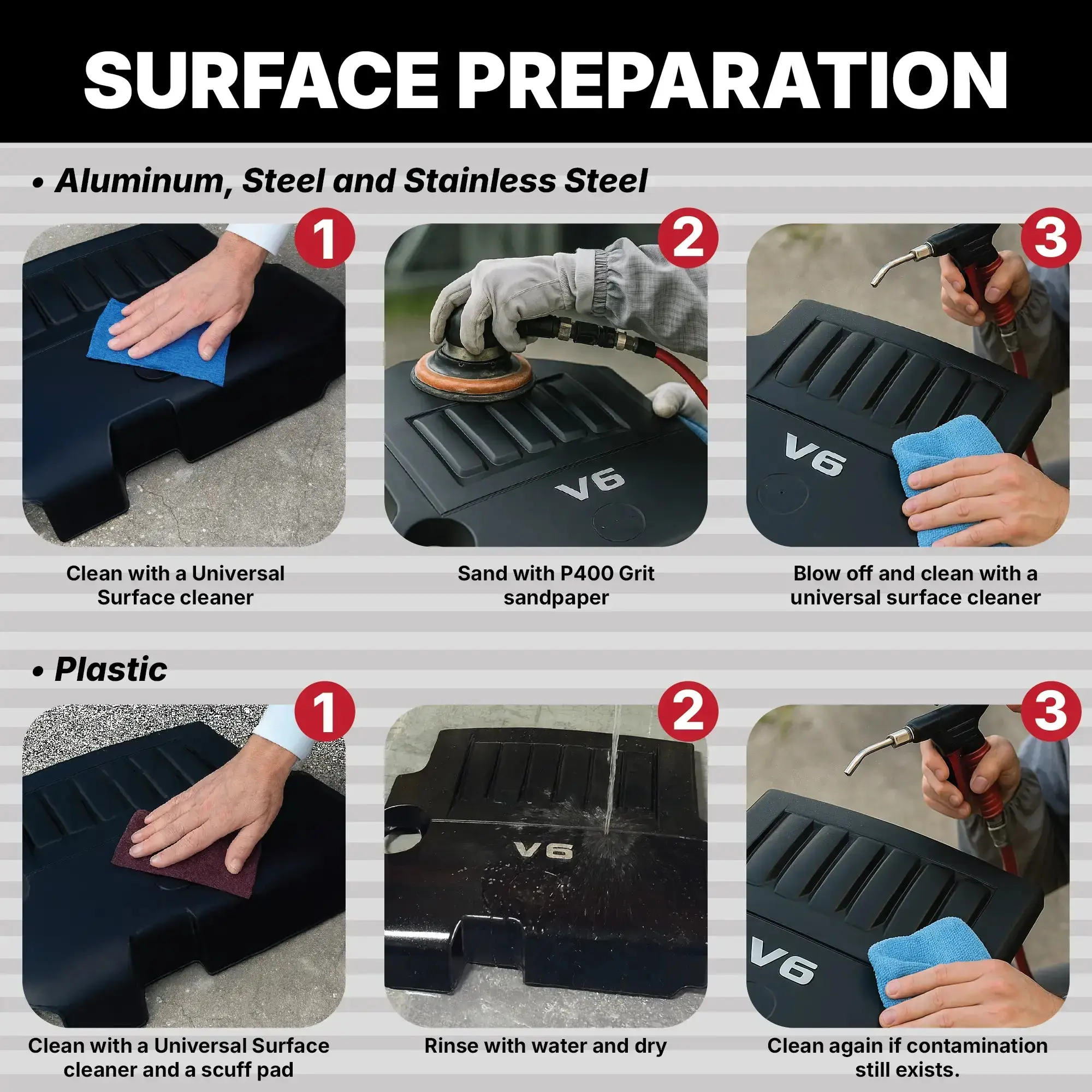 Surface Prep – Aluminum & Stainless Steel: Clean with universal surface cleaner. Remove loose paint with P400 grit sandpaper. Blow off debris and clean again.