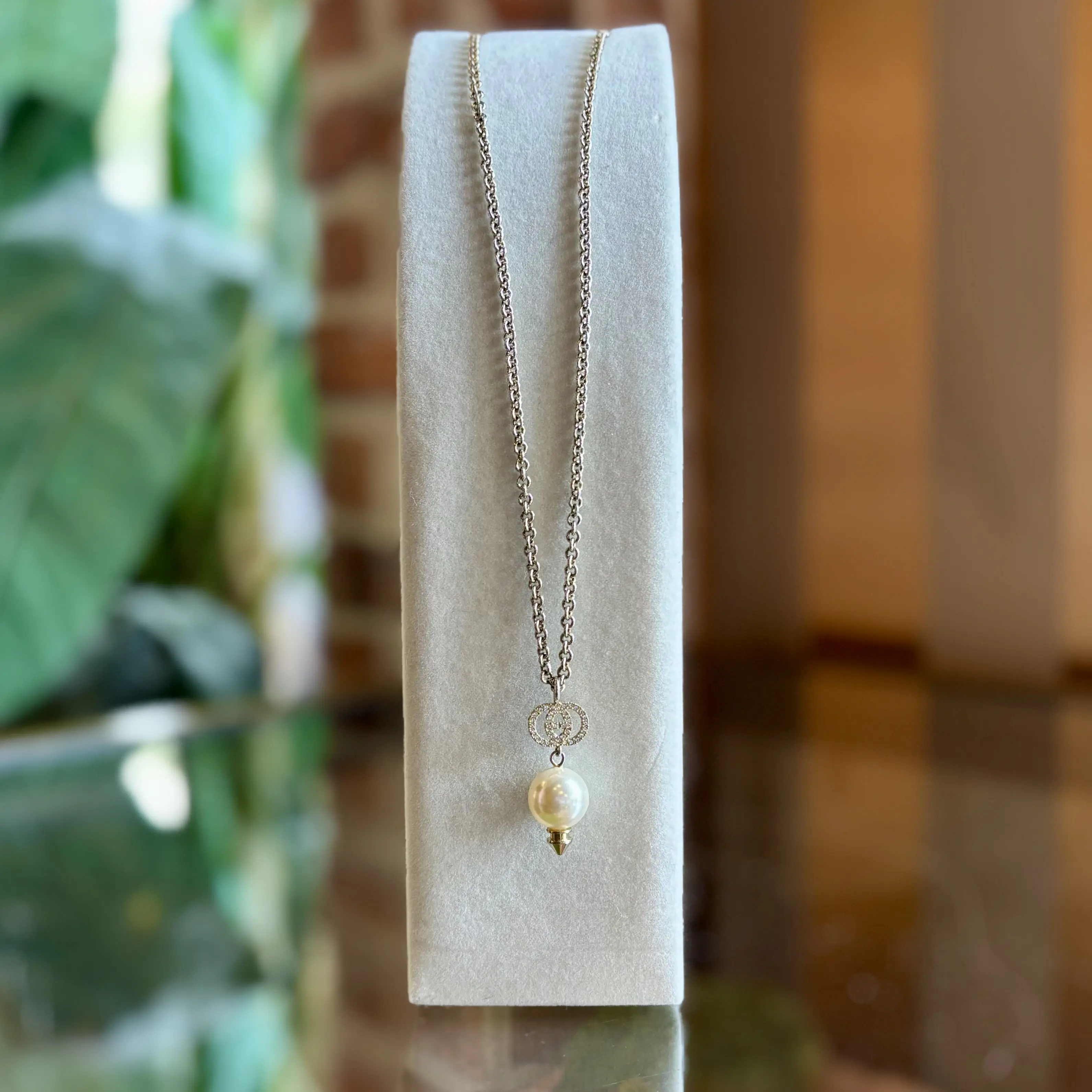 Pre-owned GUCCI Faux Pearl & Crystal Interlocking G Station Necklace
