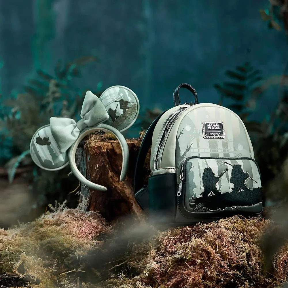 The cuddly Ewoks are marching across Minnie's mouse ears in a green, serene Endor scene featuring embroidered silhouettes and topped by a textured fabric bow. Star Wars fans will dance and sing ''Yub Nub'' for this ''endor-be-all'' souvenir headband.