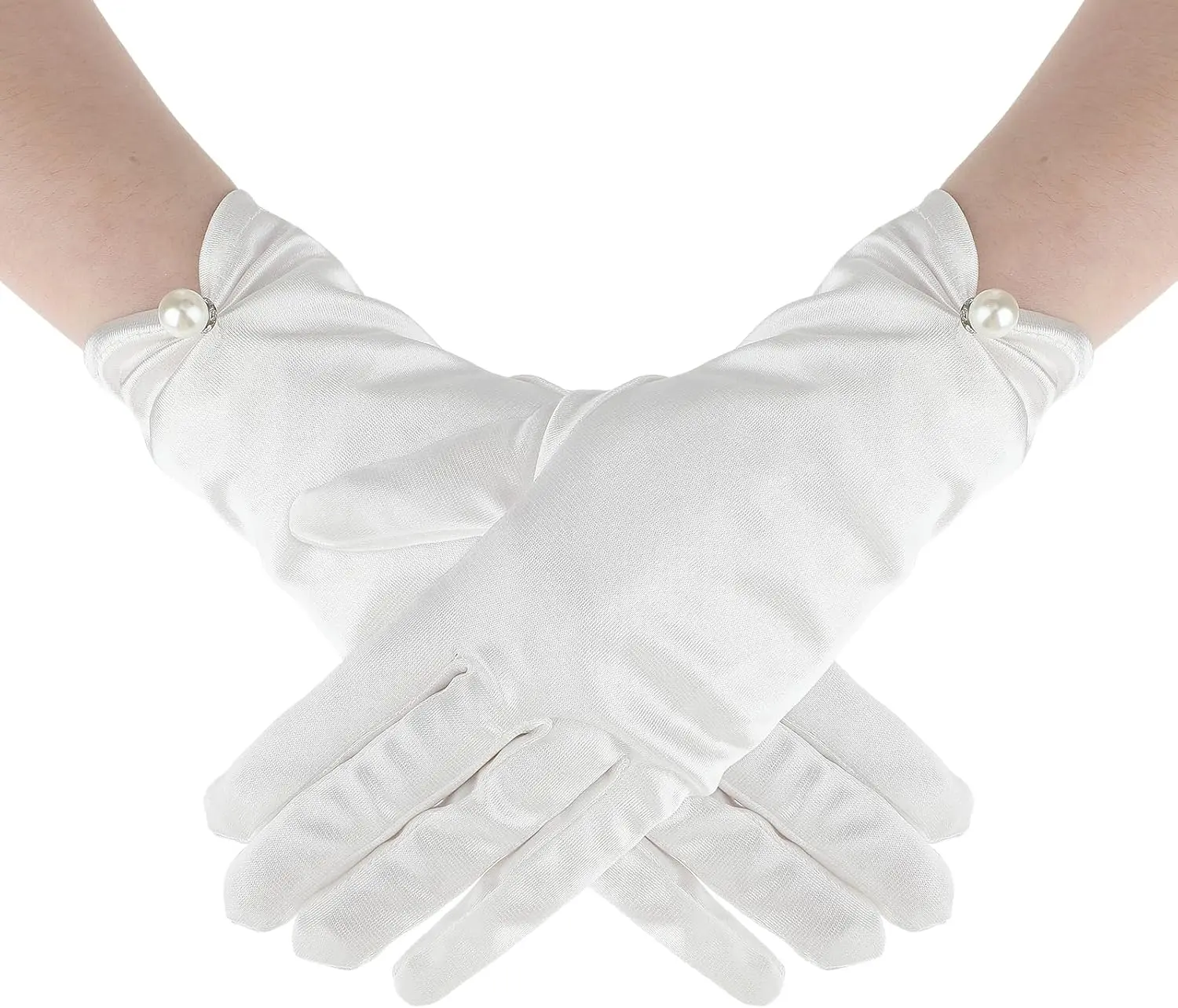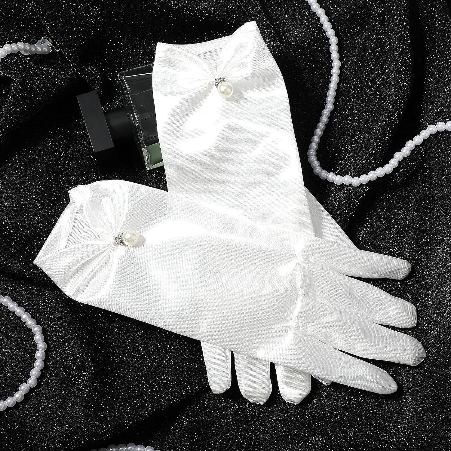 ·White Satin & Elegant Pearls: Classic white satin gloves, simple in style, pure in color, decorated with pearls, can make your hands look more slender and elegant. Matching the gloves with your clothing will also make you look very dignified and elegant, which is ideal for ladies.