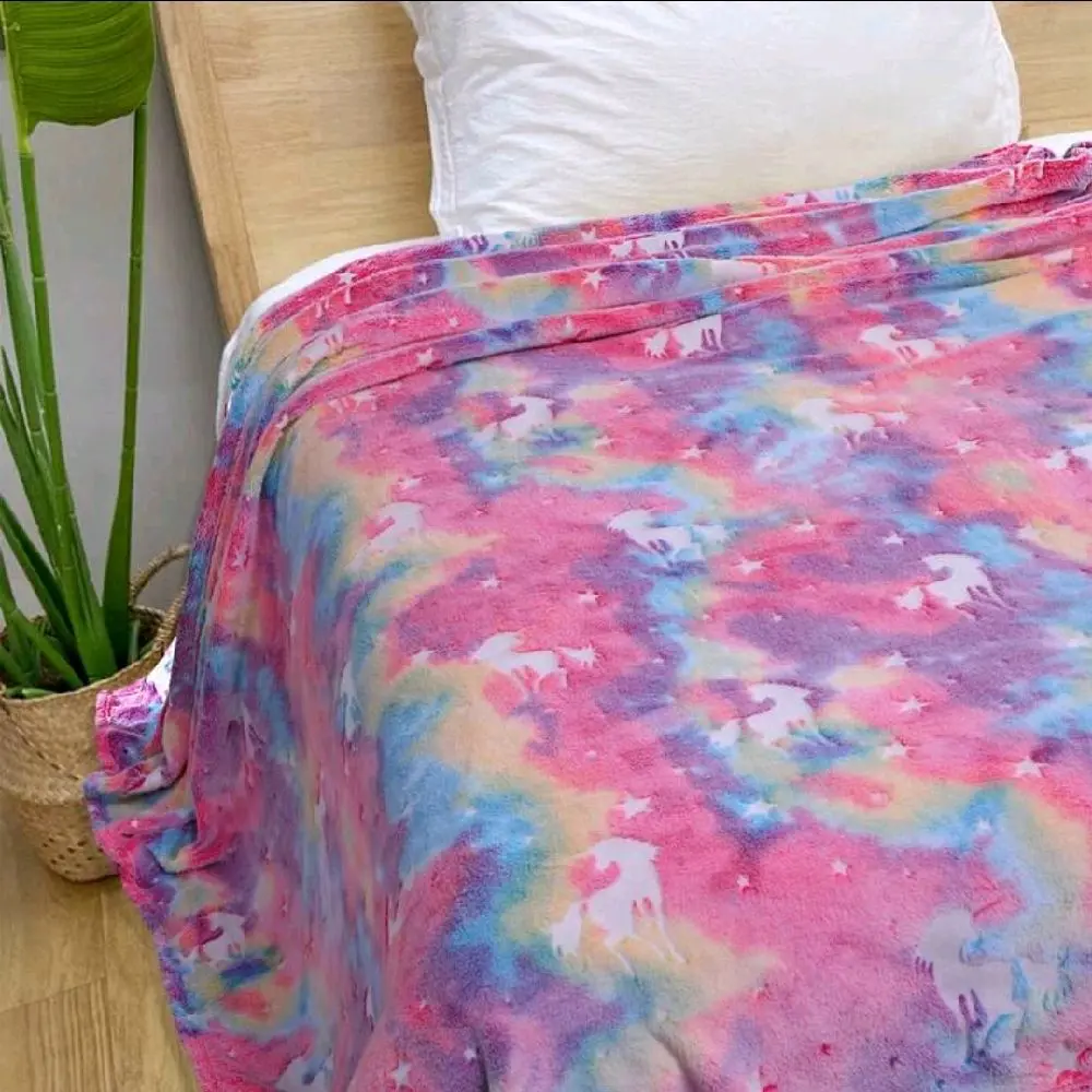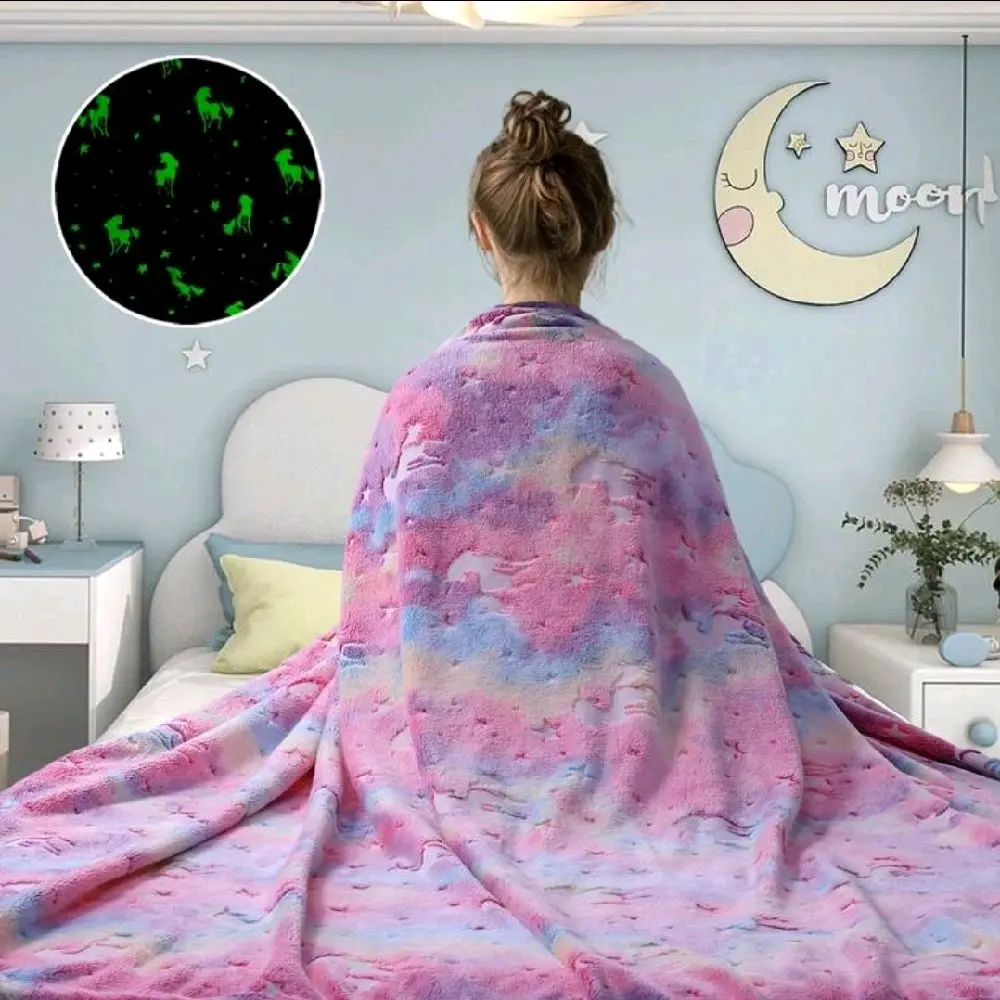 This flannel luminous blanket is ideal for children. It serves as a nap blanket, travel blanket, and a cozy companion. The colorful unicorn pattern adds a magical touch. Perfect for kids who love whimsical designs, this blanket is a fun addition to their bedtime or travel routine.