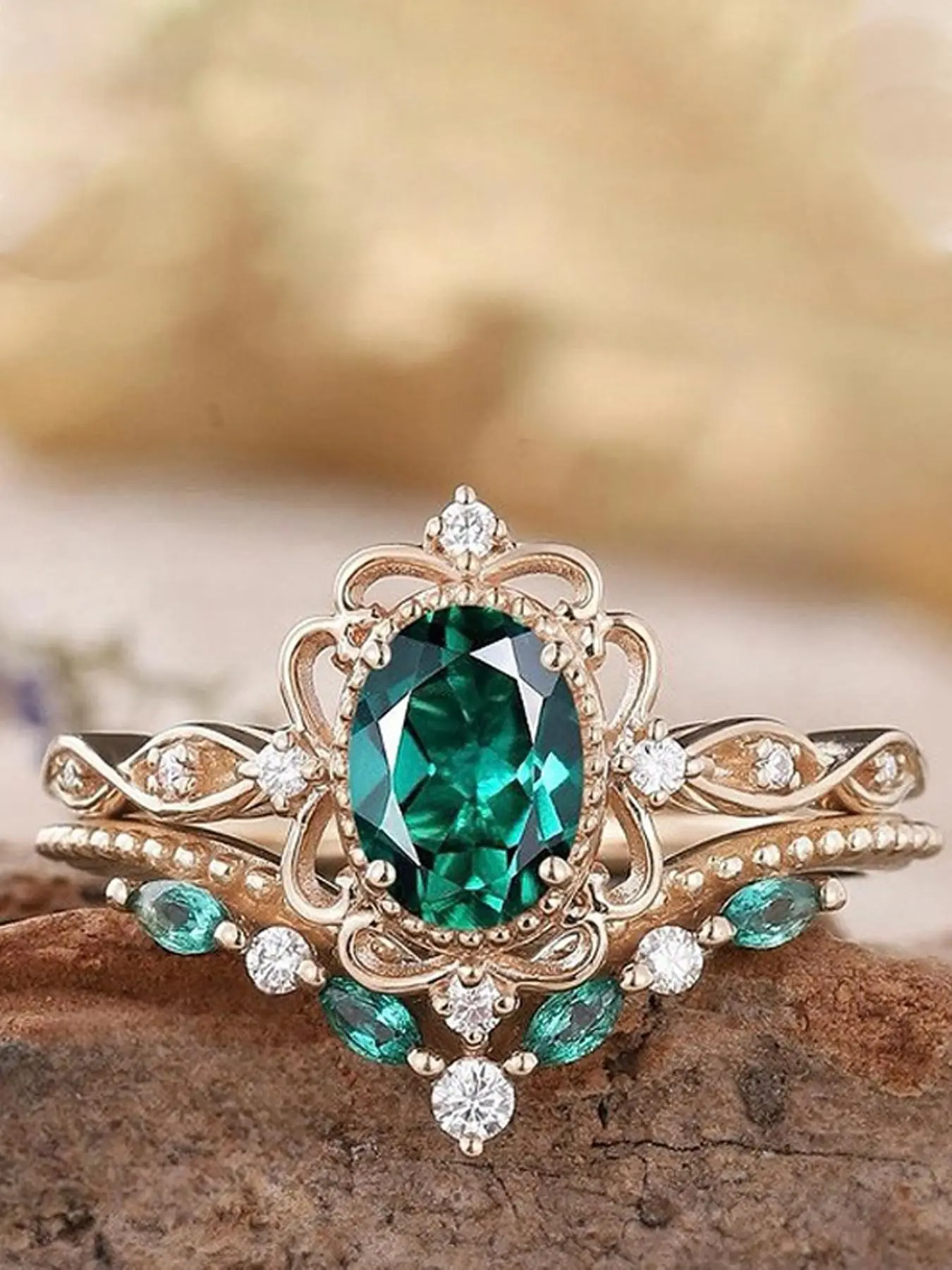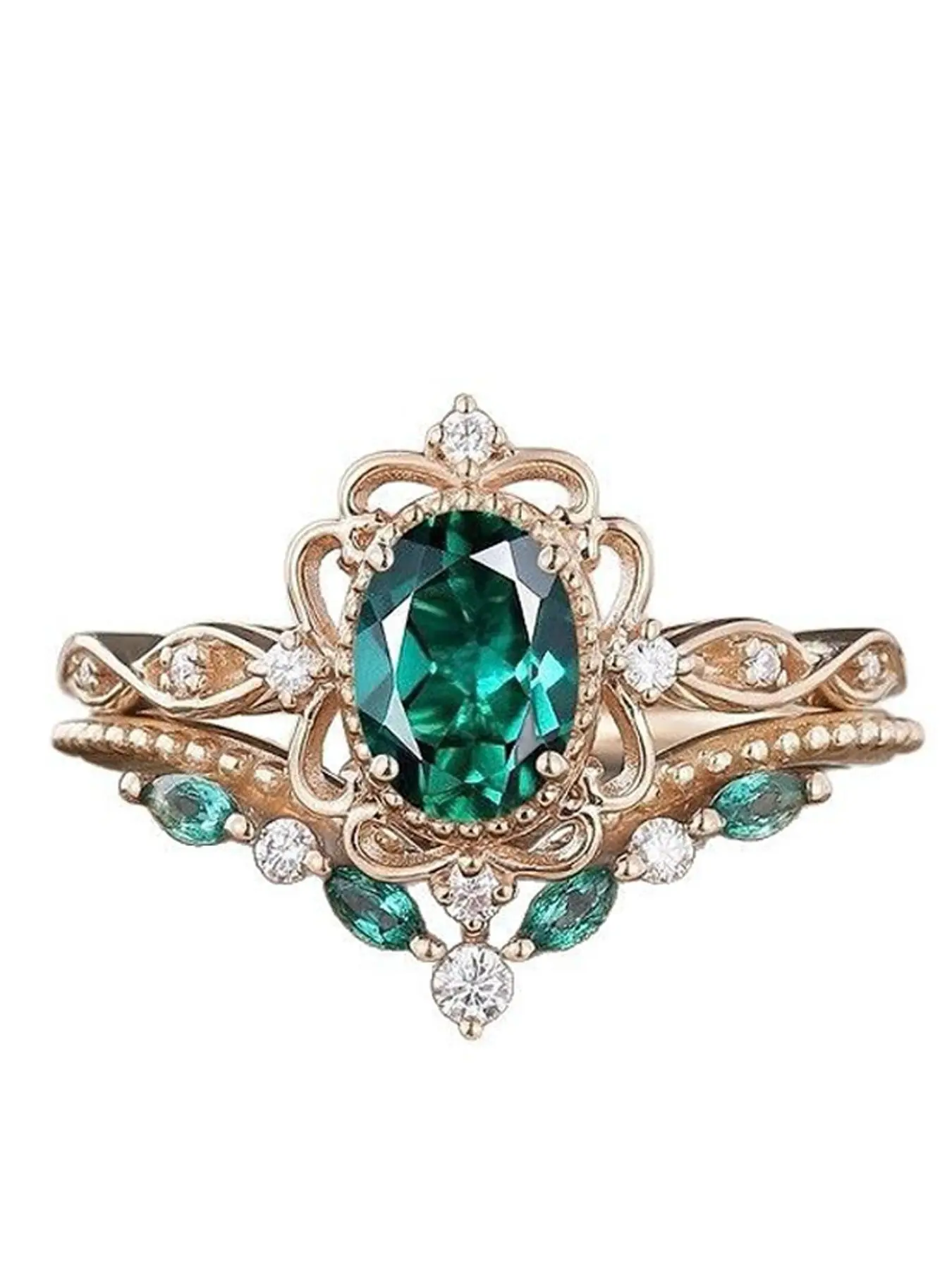Trendy Emerald Zircon Ring, Sweet European Style Alloy Band, Zircon Wedding Rings, Rose Matching Set, Perfect for Thick Fingers