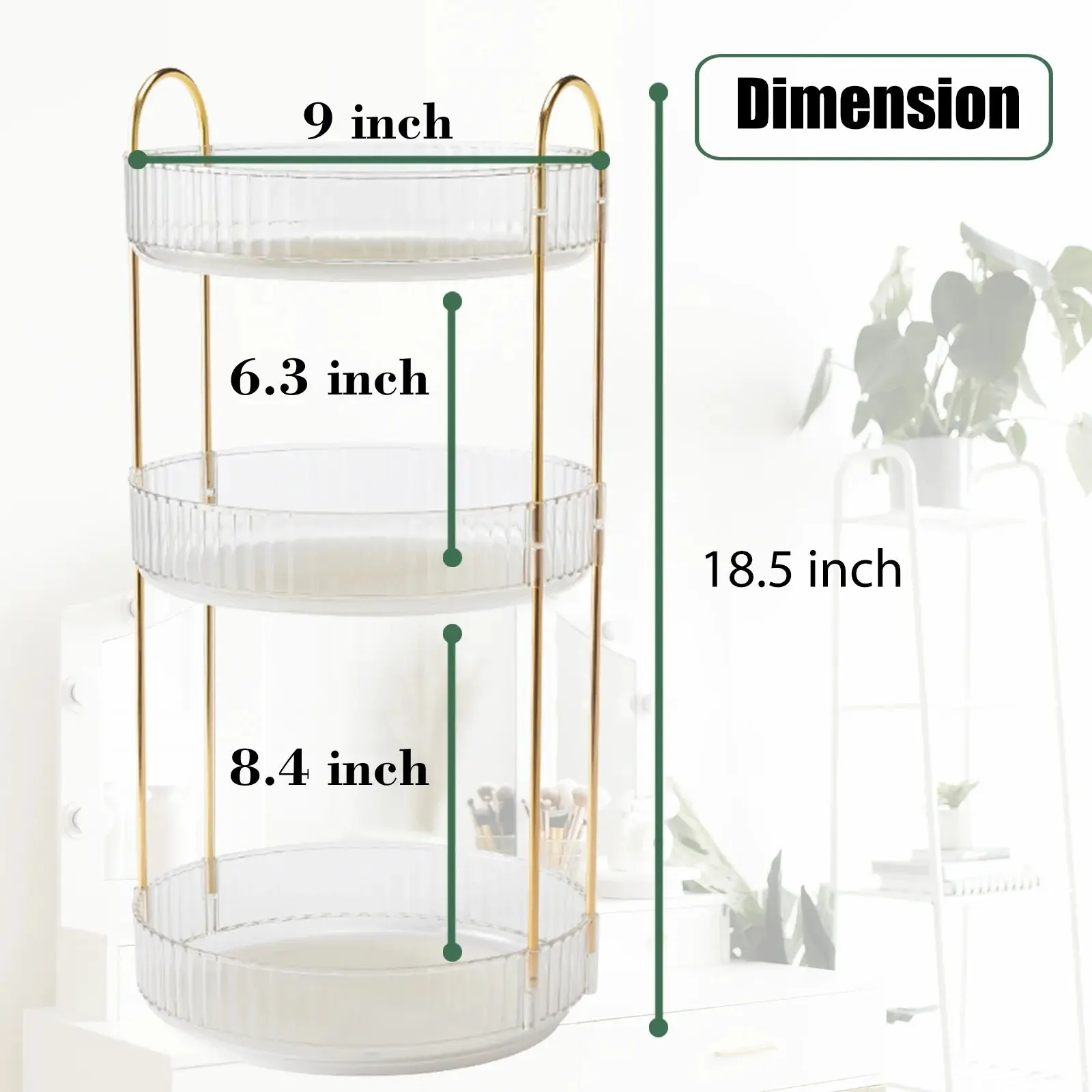 Elegant 360-degree rotating makeup organizer with 3 clear acrylic tiers. Keeps your beauty products organized, visible, and easy to access.