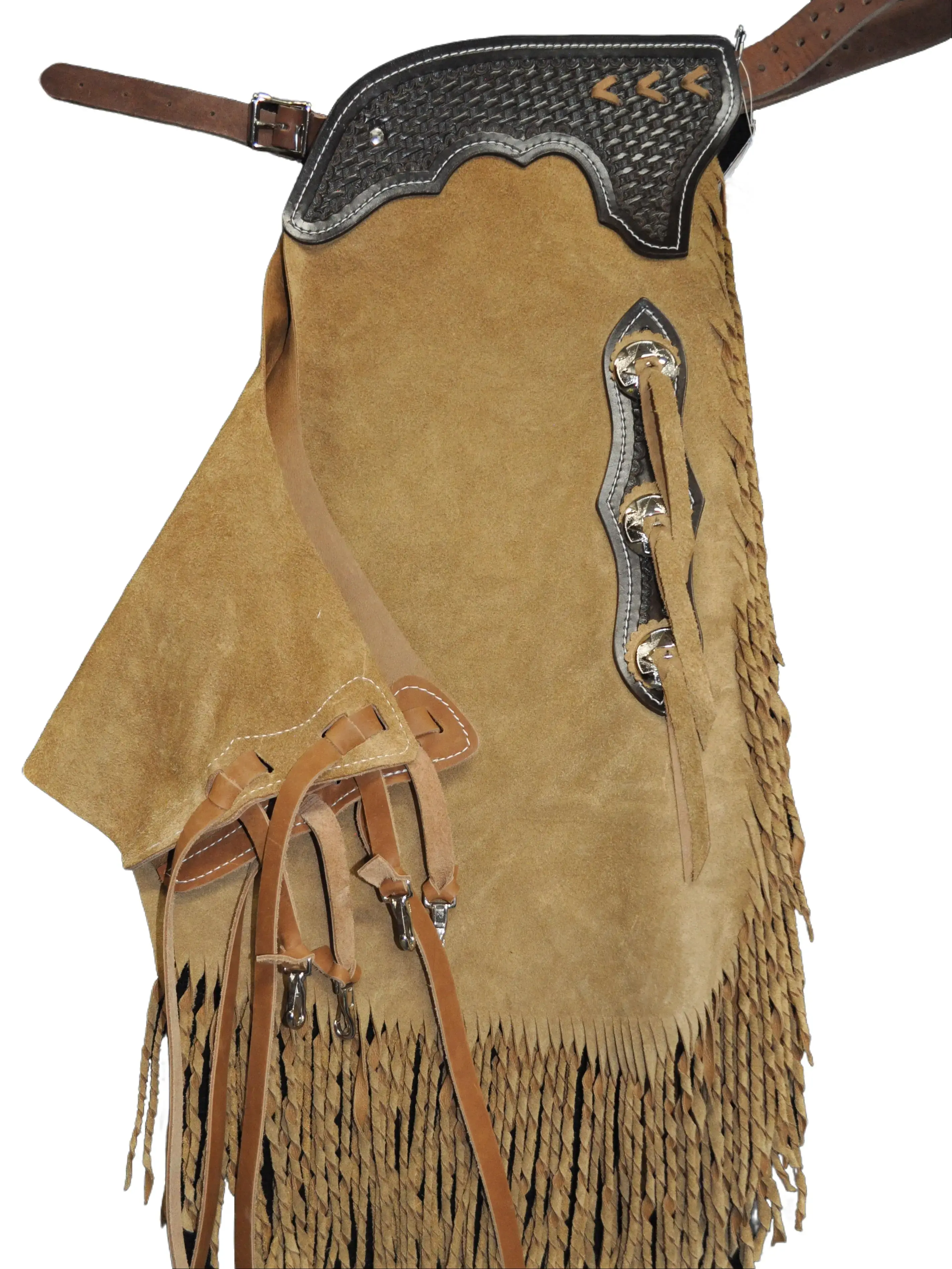These chinks are made with a quality, rough out buckskin chap leather. They have 8 oz. tooling leather trim pieces, dyed a dark brown, with a basket weave tooled stamp on them. There is 7" twisted fringe on the leg, and there are three metal conchos and two chap snaps on each leg as well.