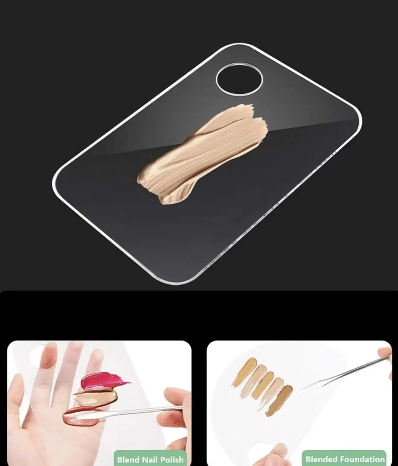 This transparent makeup mixing palette is designed for convenient and hygienic cosmetic application. Made from high-quality acrylic material, it provides a smooth surface for mixing different makeup products such as foundation, concealer, lipstick, and cream formulas.