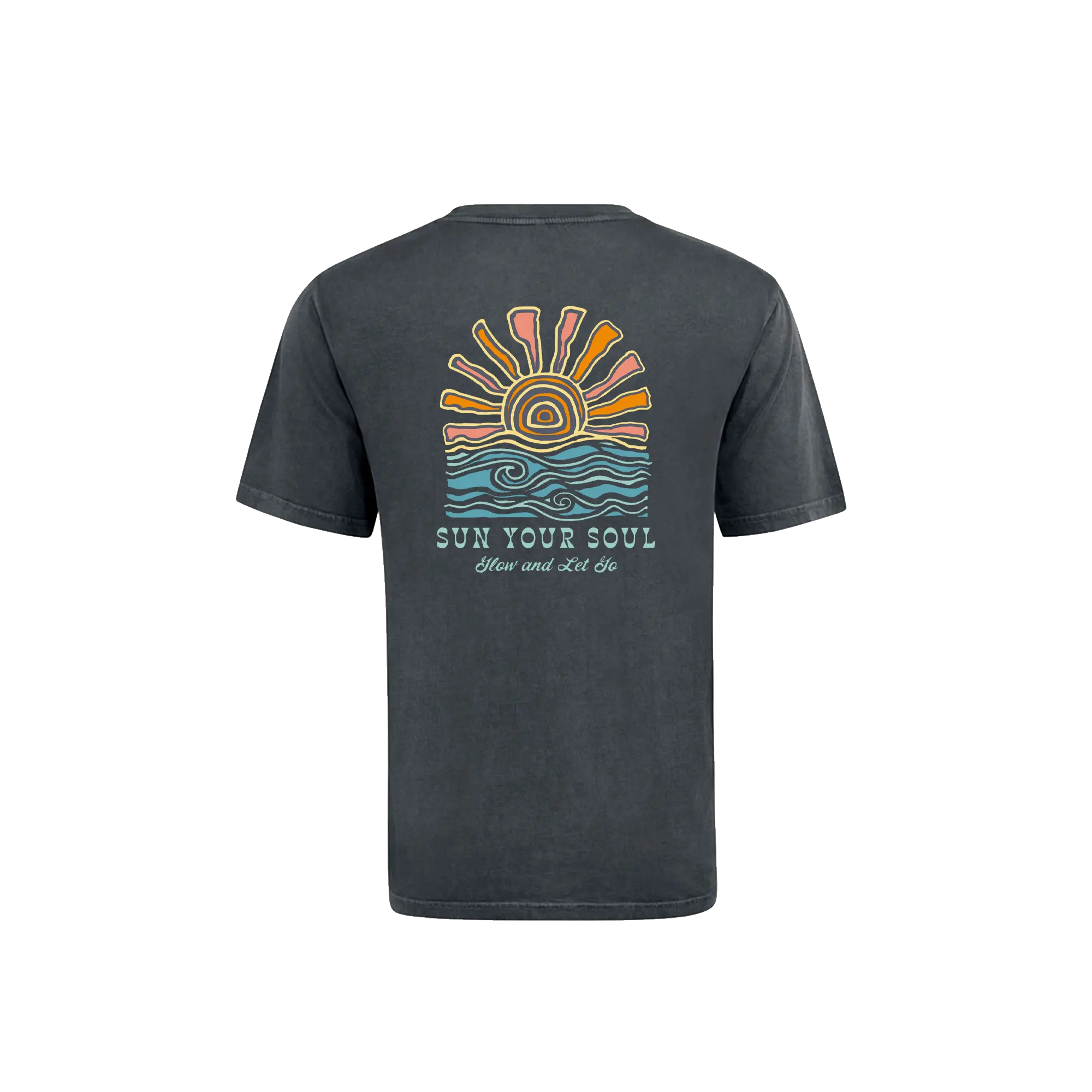 The Oriana t-shirt features a hand-drawn rising sun and flowing waves, symbolizing balance, release, and steady energy. Pigment-dyed black for a soft, worn-in feel, this tee is made for everyday comfort—whether you’re near the water or just need a reminder to take it easy.