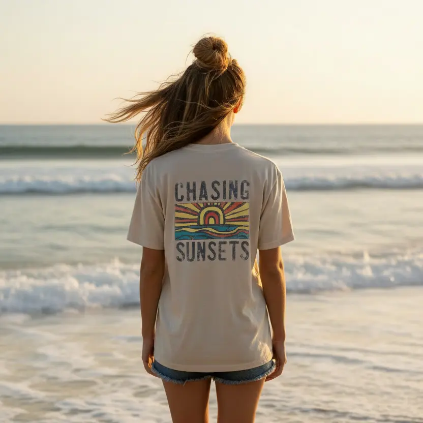 The Chasing Sunsets Tee captures that quiet moment at the end of the day when the light softens and everything slows down. Featuring a vintage inspired sunset over ocean waves and the message Chasing Sunsets, it’s a reminder to keep seeking the moments that make you pause and breathe it all in.