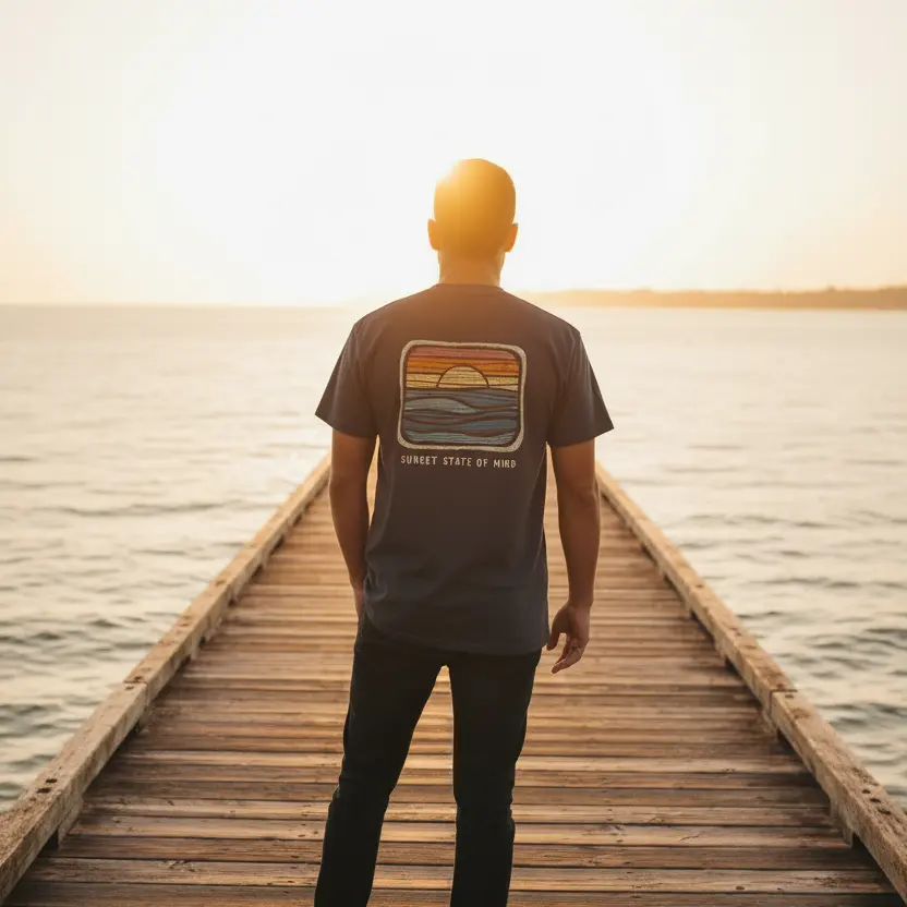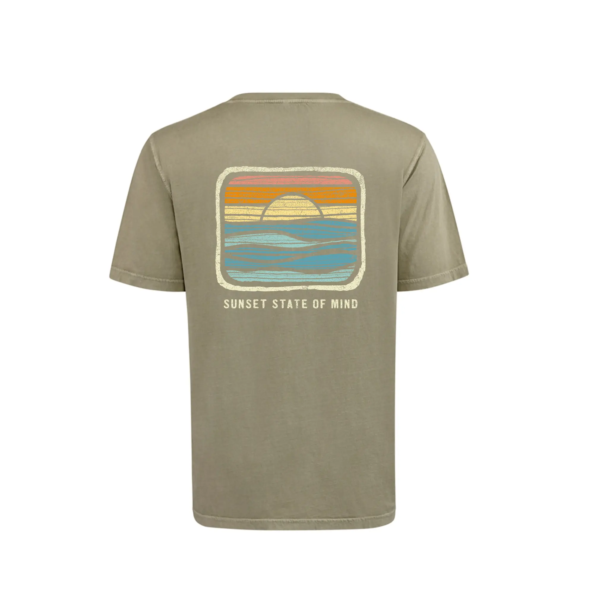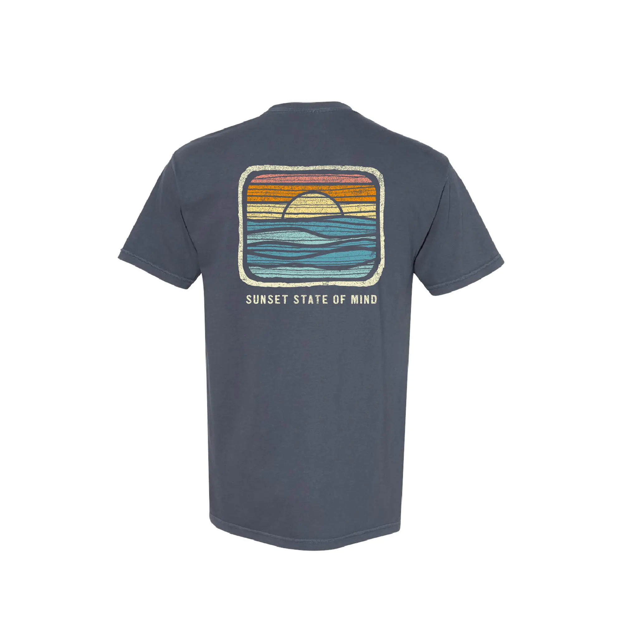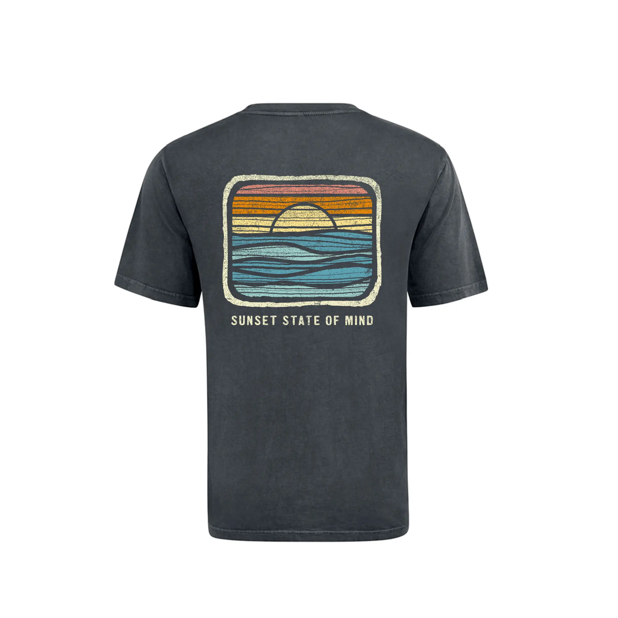 The Striped Paradise Tee captures the colors and calm of the day’s best moment. Featuring a vintage inspired sunset over layered waves and the phrase Sunset State of Mind, this design is a reminder to slow down, breathe deep, and let the day fade gently into evening.