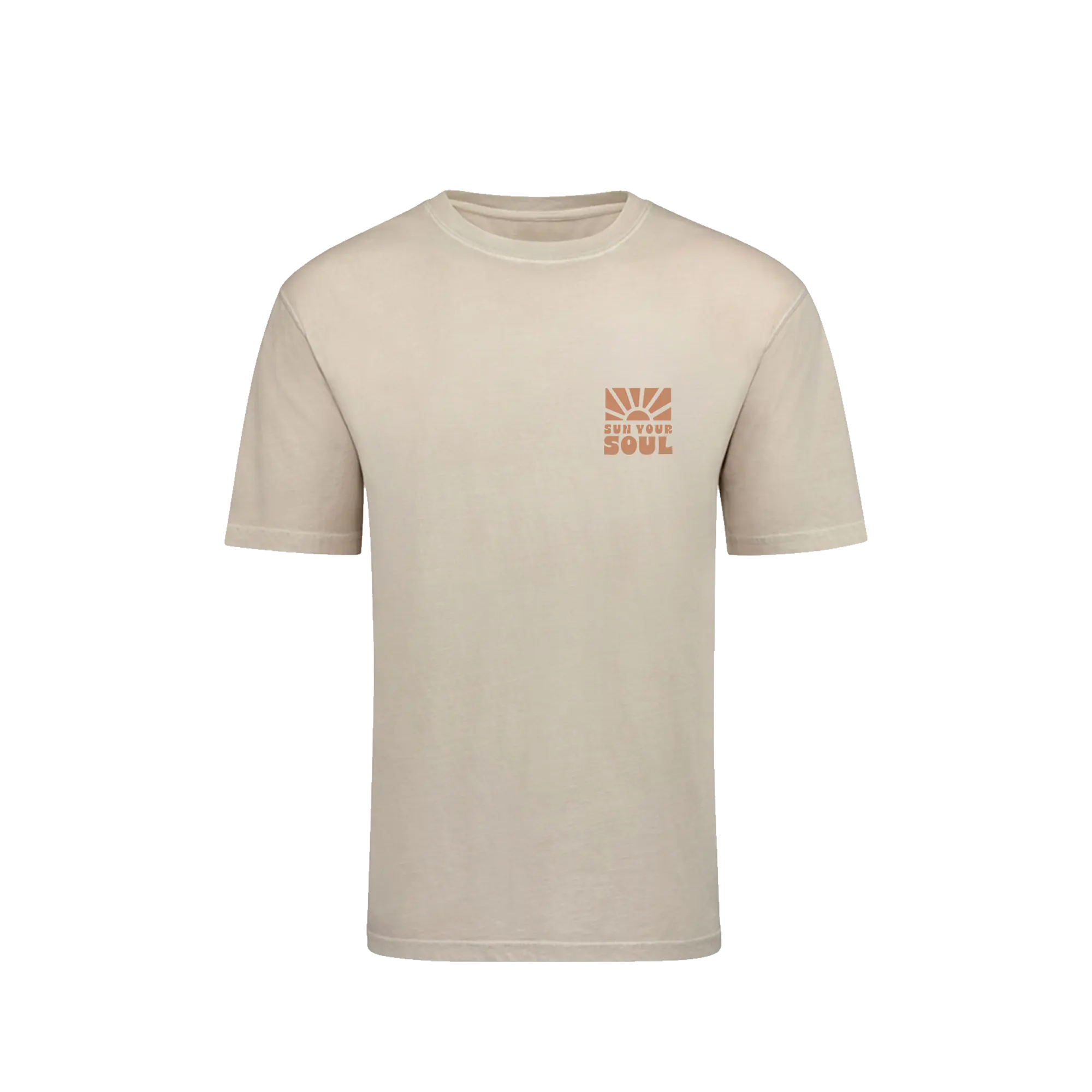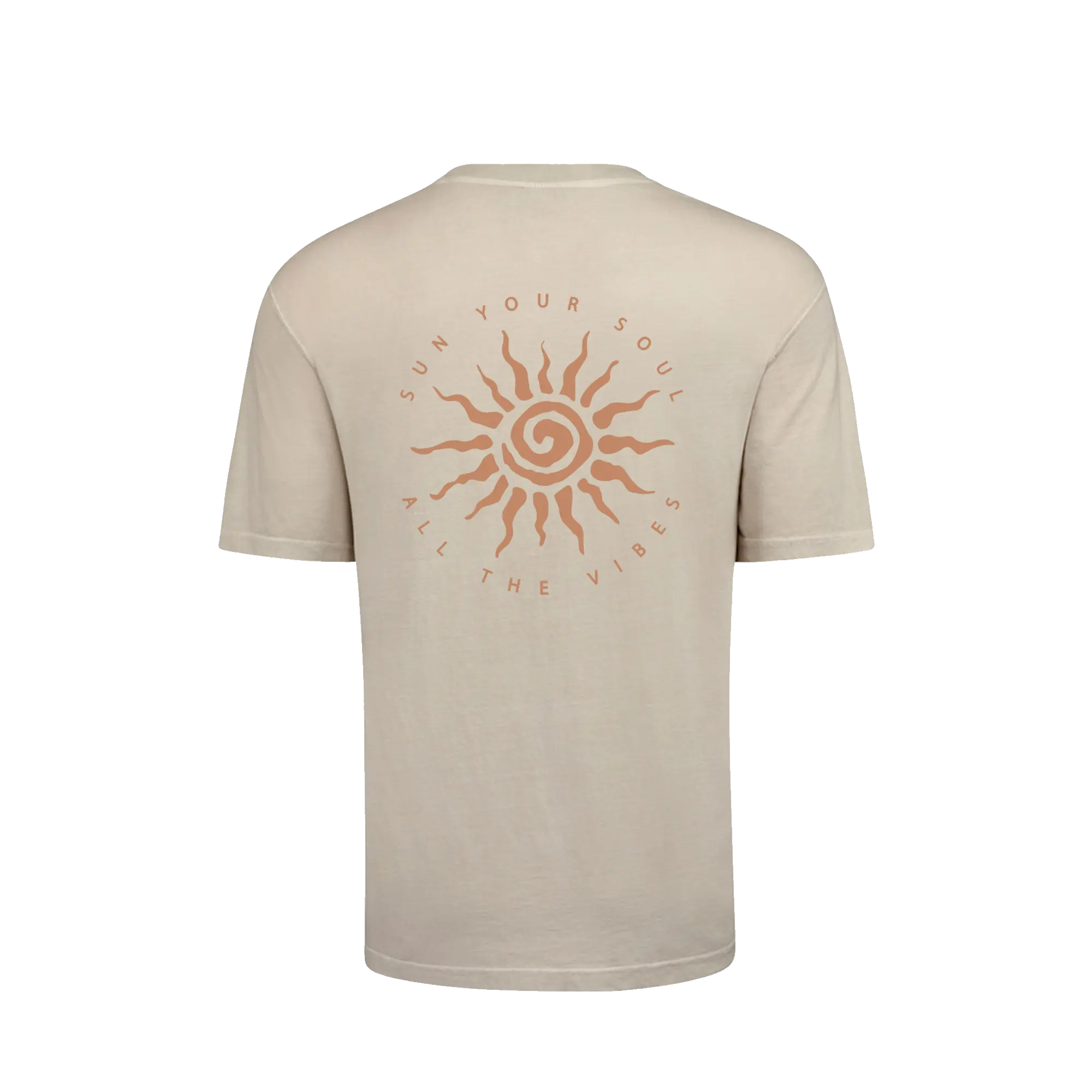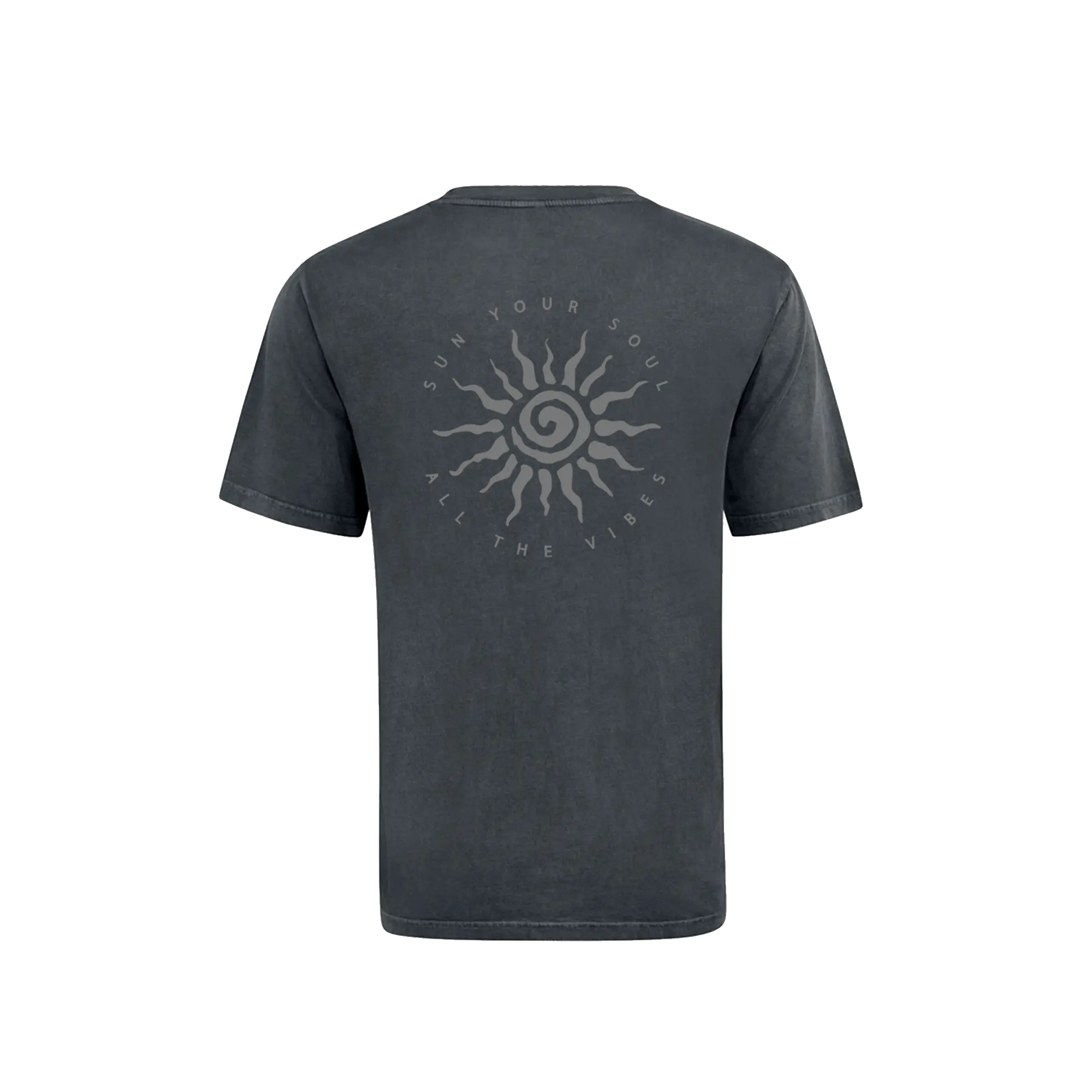 The Eternal Sun Tee features a subtle Sun Your Soul chest mark and a bold back graphic built around the message “Sun Your Soul. All The Vibes.” The spiral sun design captures the warmth, energy, and freedom that inspired the brand.
