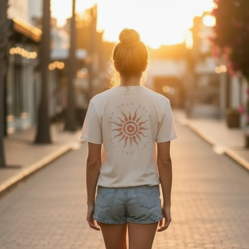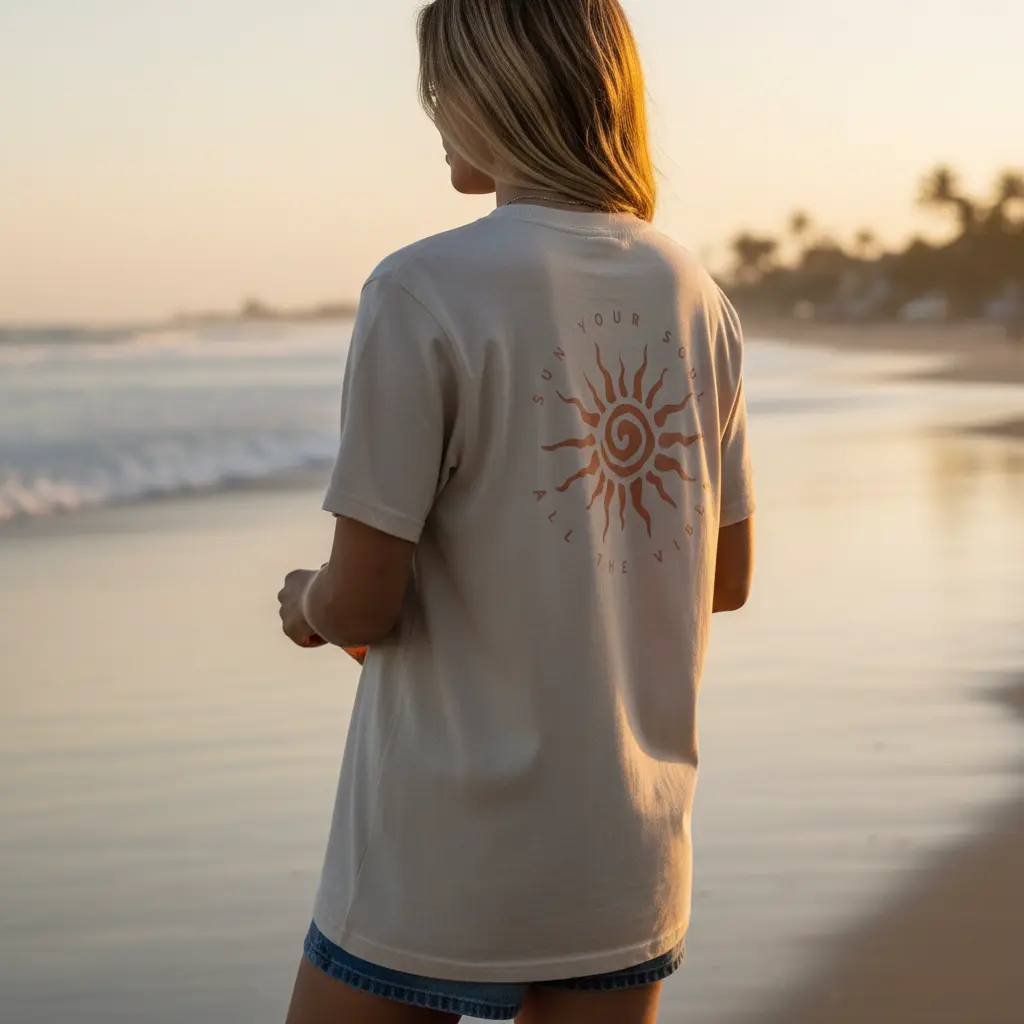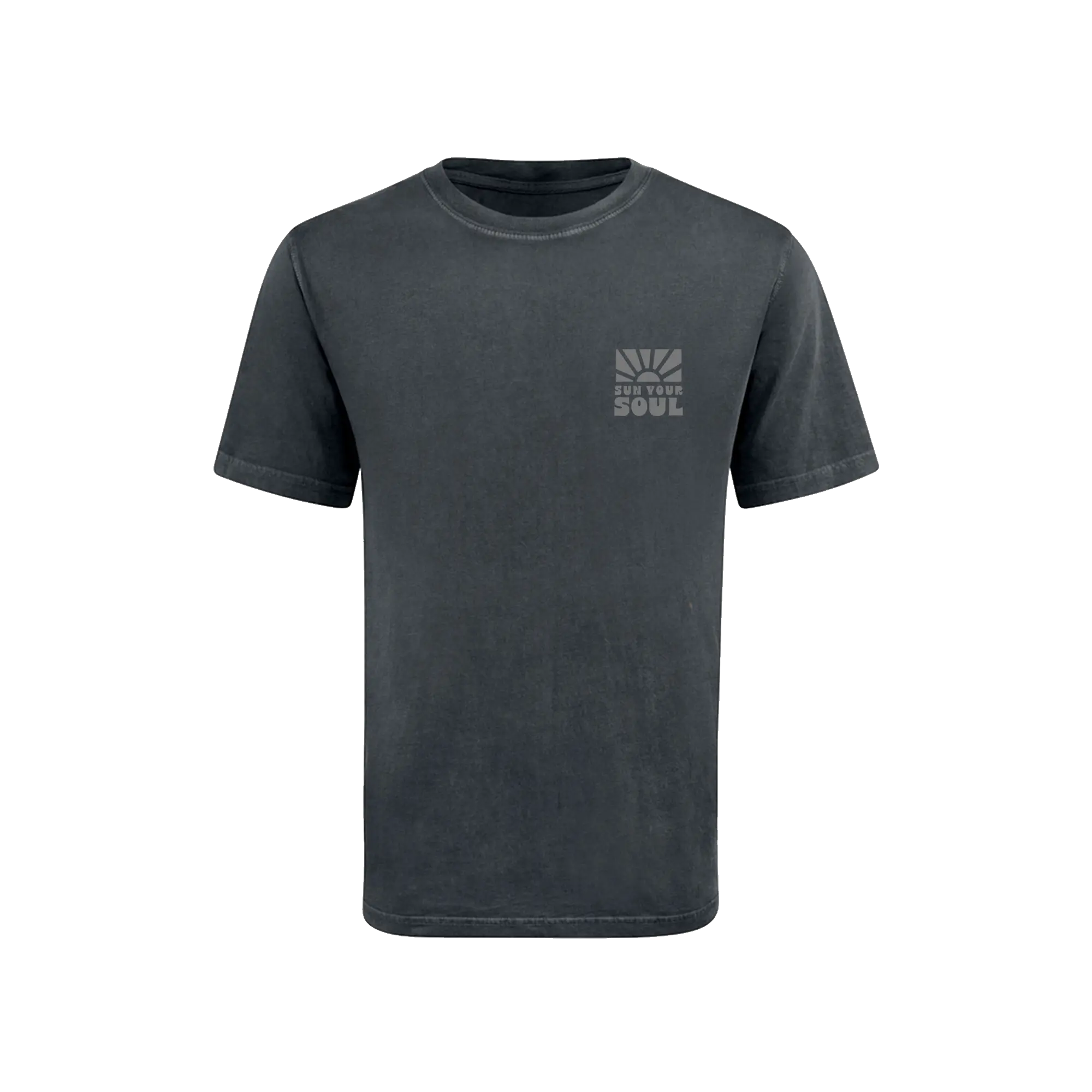 The Eternal Sun Tee features a subtle Sun Your Soul chest mark and a bold back graphic built around the message “Sun Your Soul. All The Vibes.” The spiral sun design captures the warmth, energy, and freedom that inspired the brand.