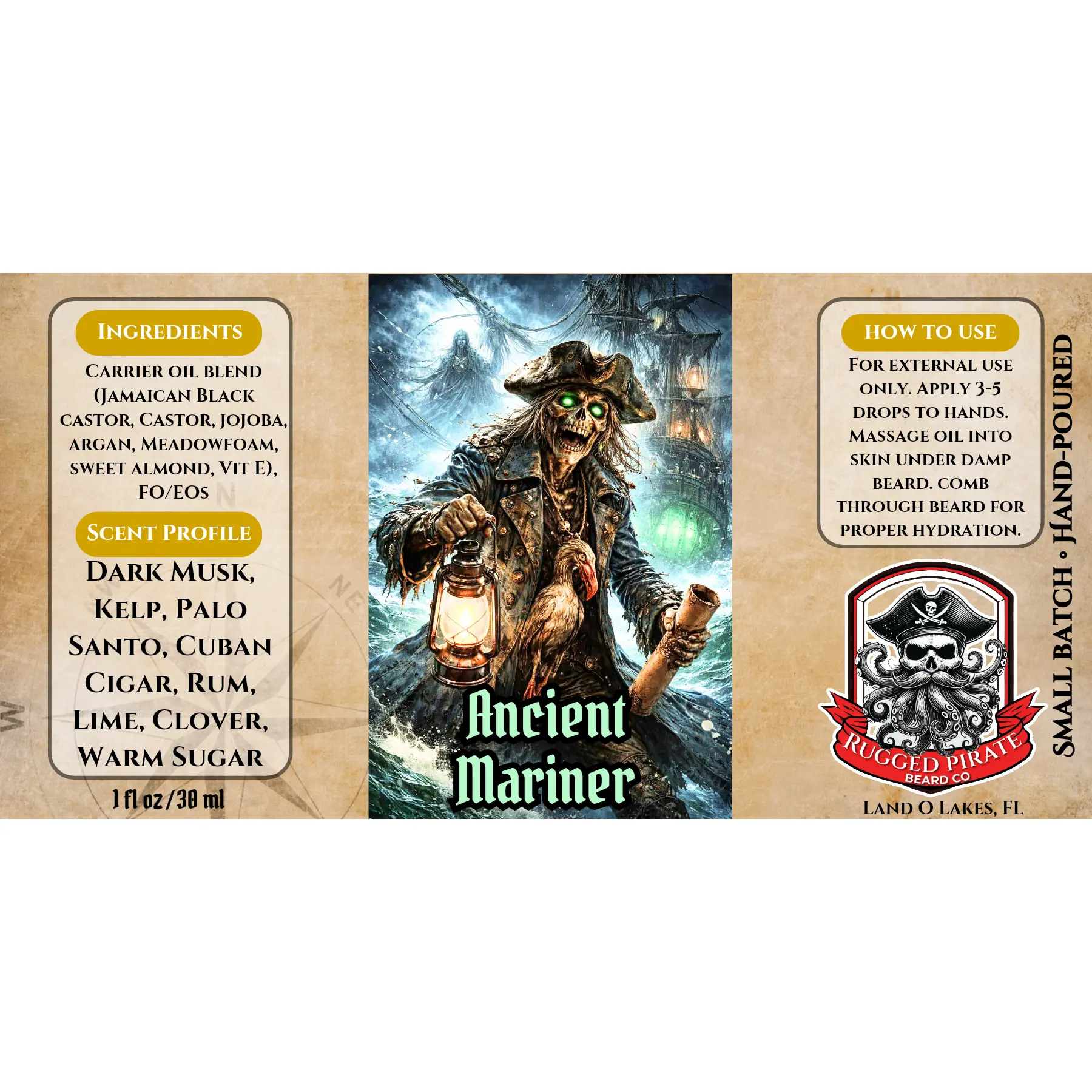 Ancient Mariner is a haunting, ocean-forged beard oil crafted for those who carry the weight of the sea and the stories it refuses to forget. Handcrafted in small batches in Land O’ Lakes, Florida, this premium beard oil conditions, softens, and nourishes the beard while delivering a dark, marine scent layered with driftwood smoke, aged rum, and eerie depth.