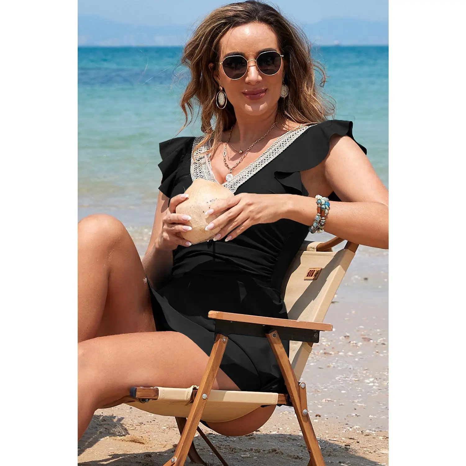 ·One piece swim dress with a popular tummy control design.Sweet shape with ruched details aside, and a flared skirt.It has a lace accent v neckline, and ruffled short sleeves.Made from quality swimming fabric with removable bra pads.