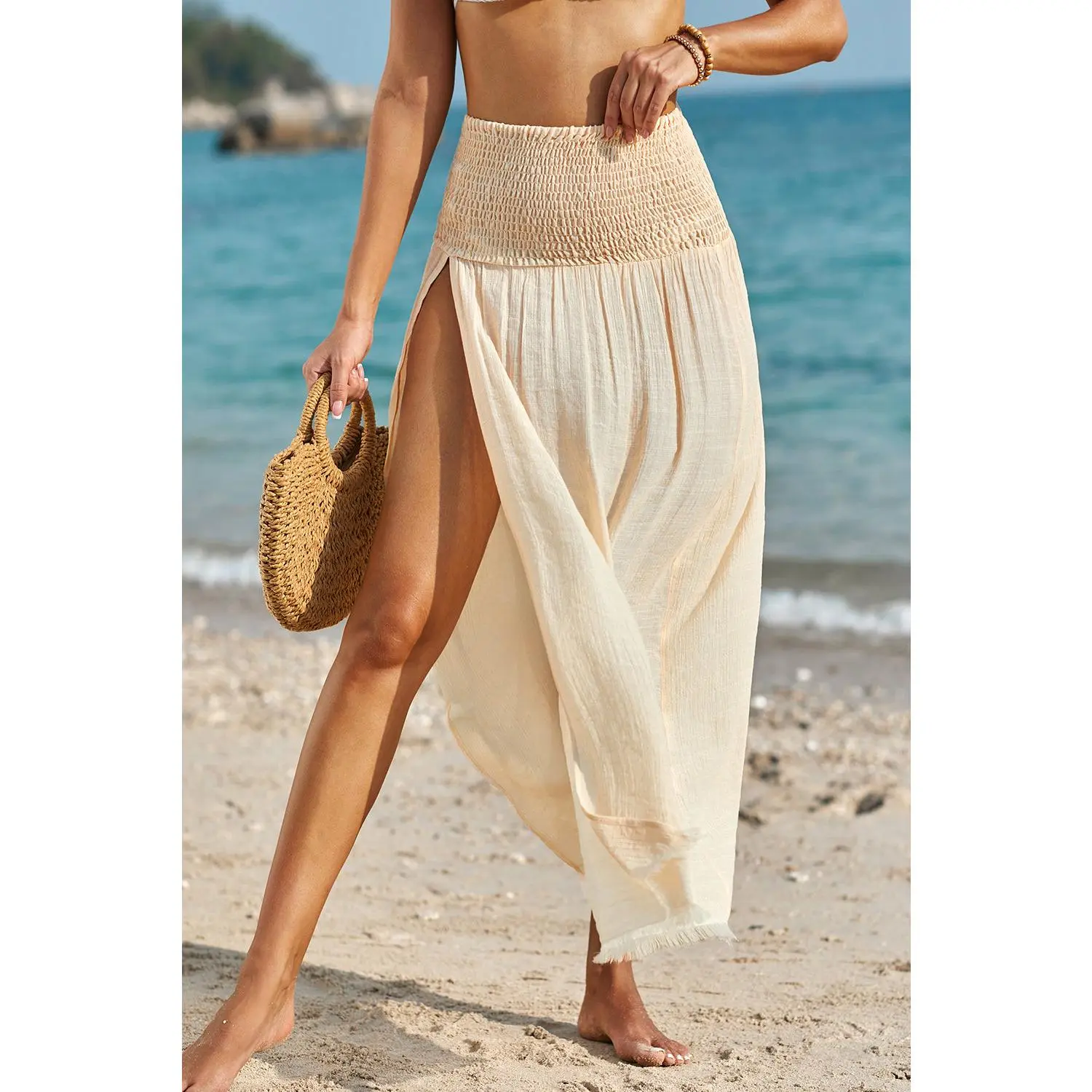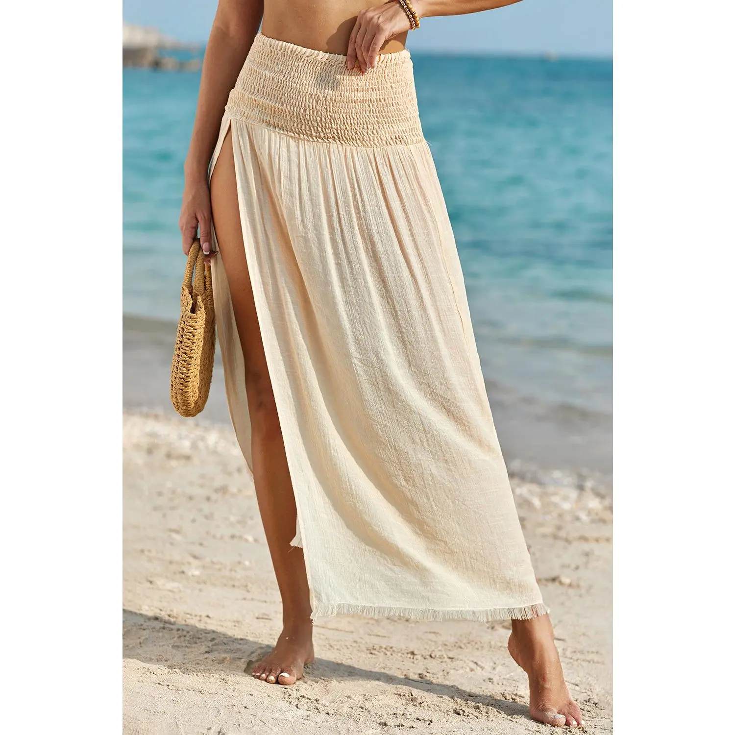 Pale Khaki Shirred High Waist Split Long Beach Skirt