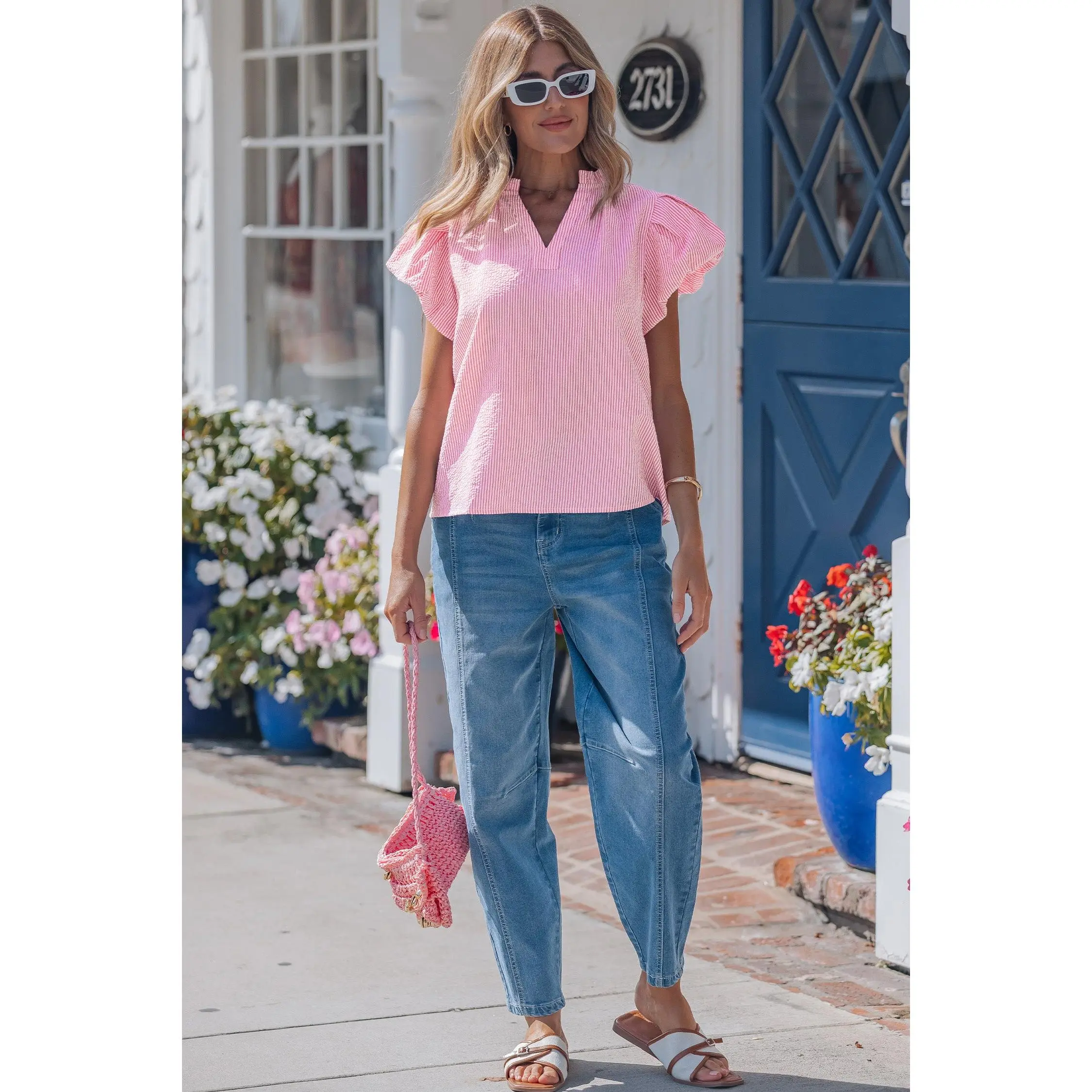 Rose Stripe Short Bubble Sleeve Split V Neck Blouse