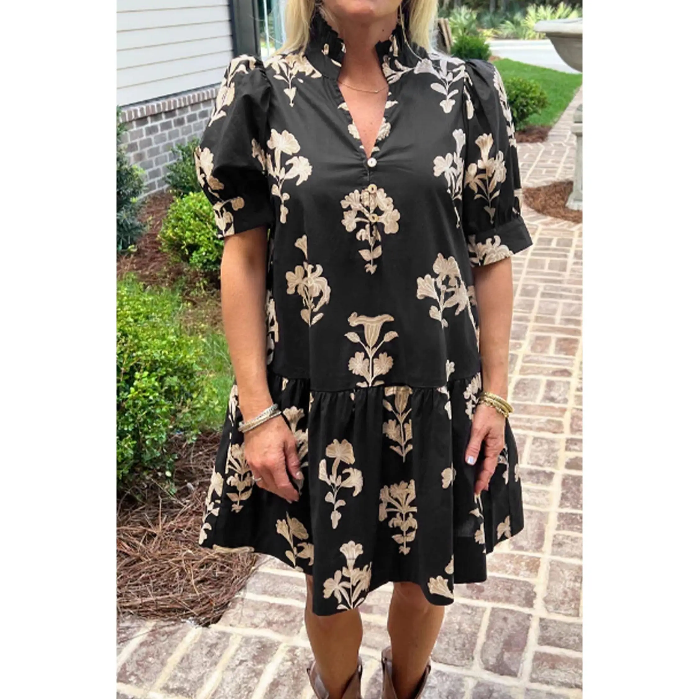 Green Frilled V Neck Puff Short Sleeve Floral Mini Dress
