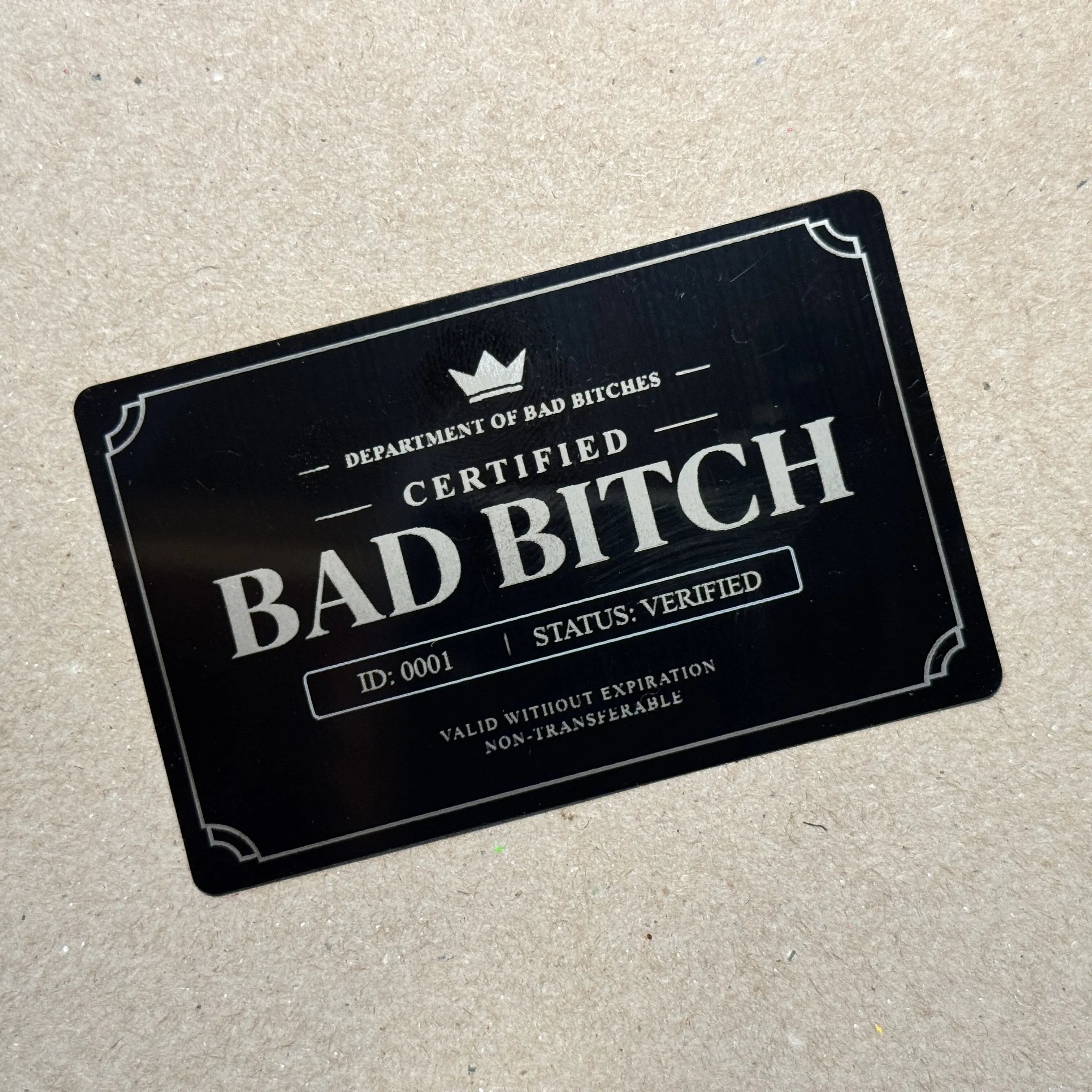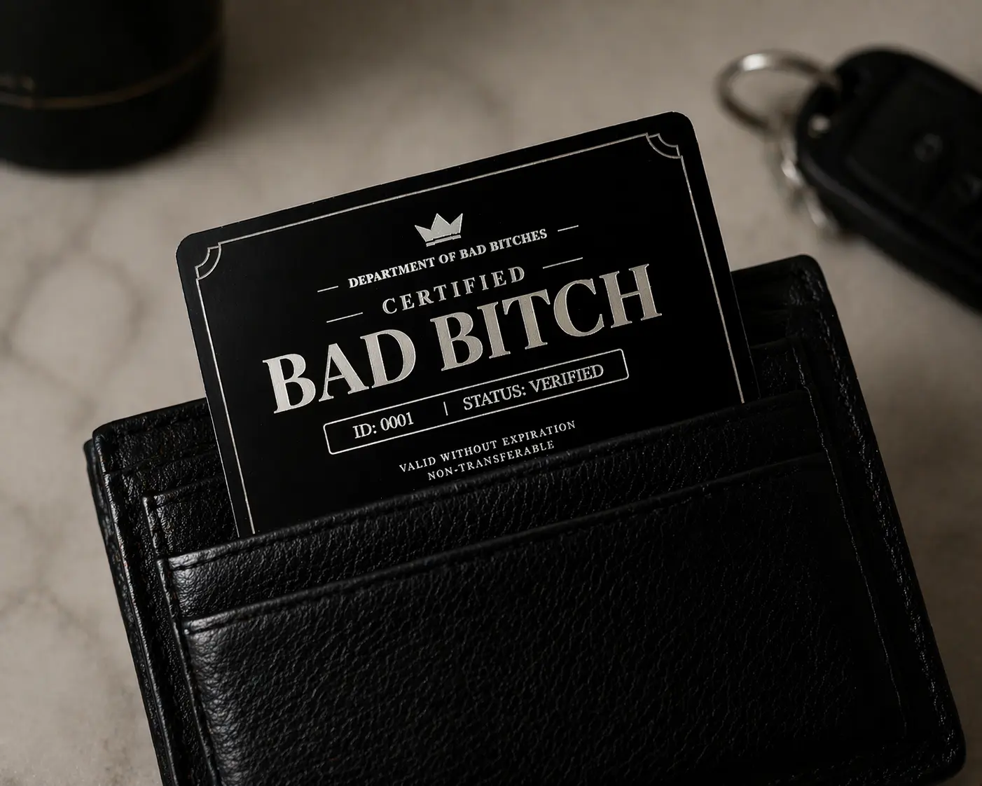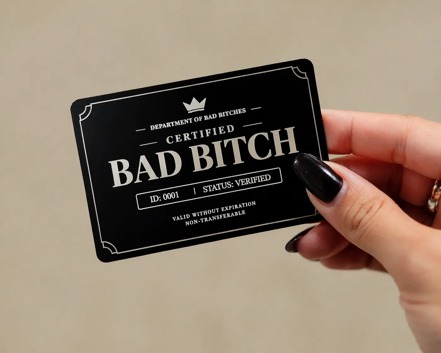This Certified BAD BITCH card is the ultimate pocket-sized statement piece. Designed to look clean, bold, and unmistakably official — because you don’t need extra fluff when the title speaks for itself.