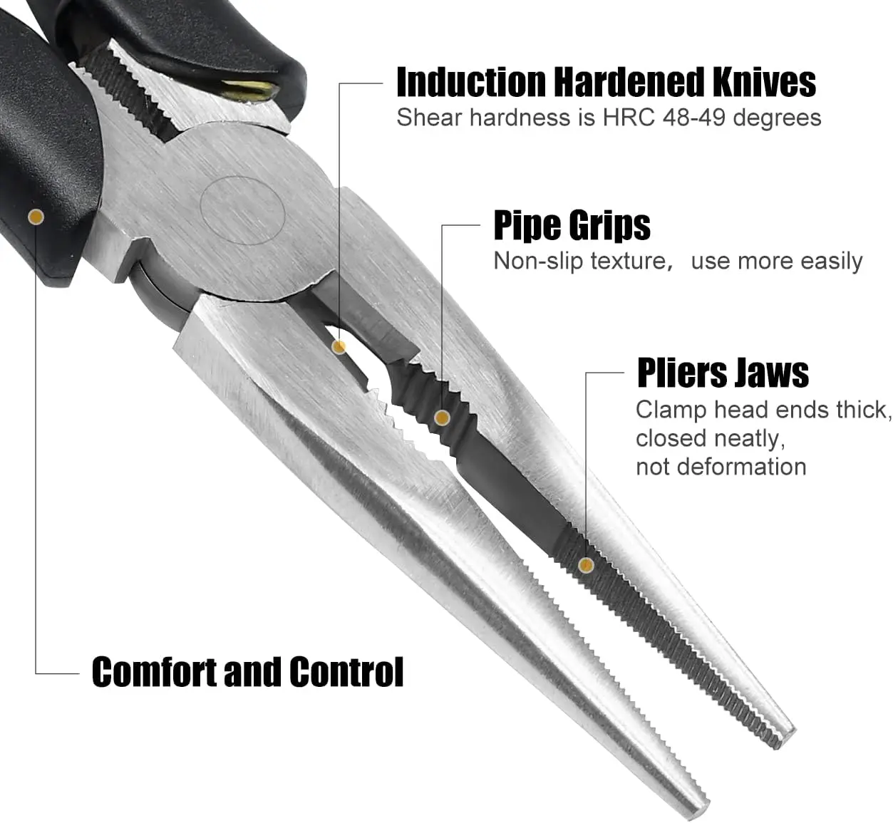 ·【Strong Cutting Force】The cutting edge hardness of HRC60-62, shear hardness of HRC48-49, can easily cut single strand; The end of the nose pliers is neat, closed well, the head of the pliers is thick, and it is not easy to misposition and deformation when using