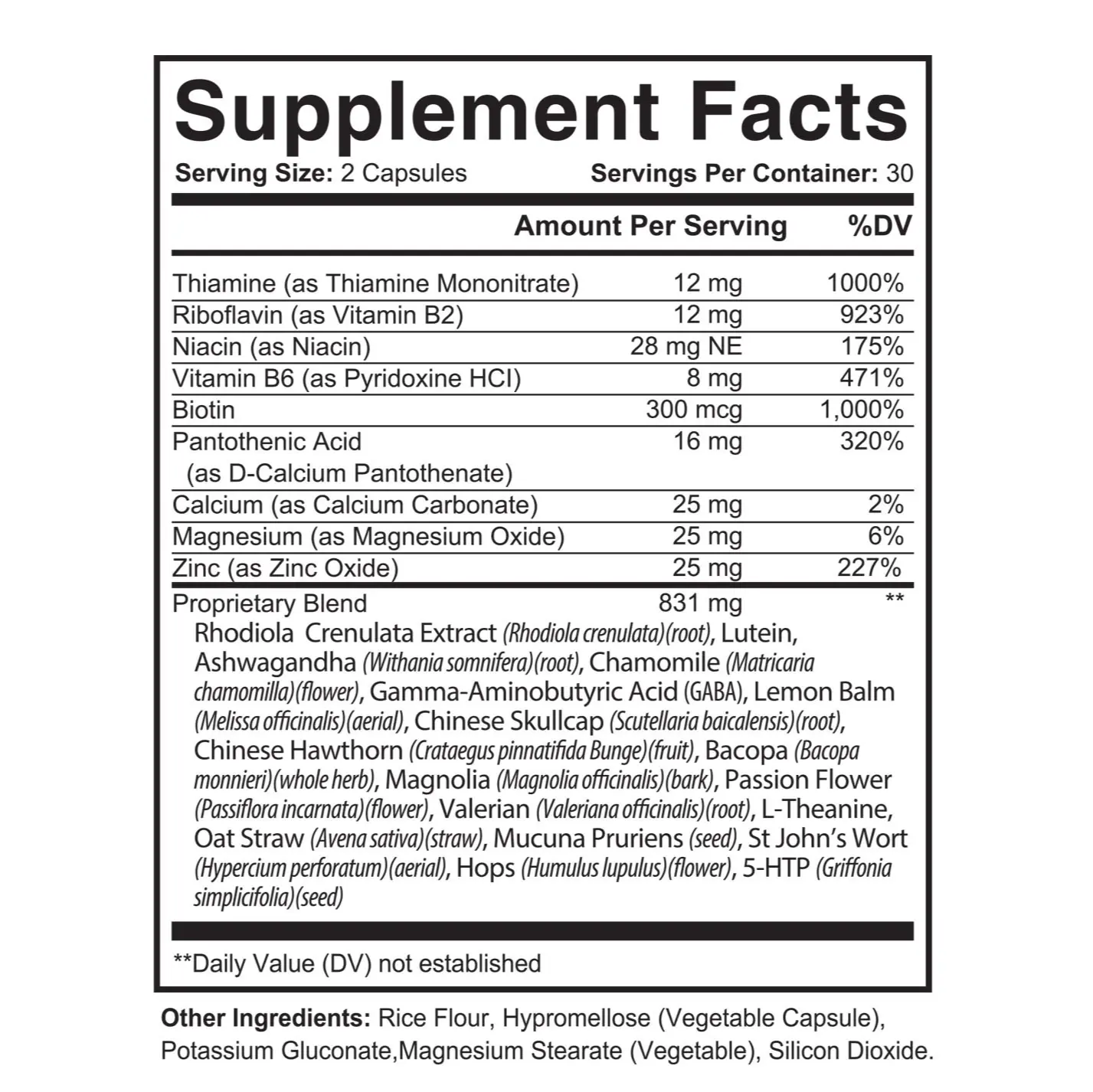 Plus a proprietary plant blend of ASHWAGANDHA, L-THEANINE, GABA (GAMMA-AMINOBUTYRIC ACID), CHAMOMILE & LEMON BALM EXTRACTS, 5-HTP, and RHODIOLA ROSEA for stress relief and mood balance.