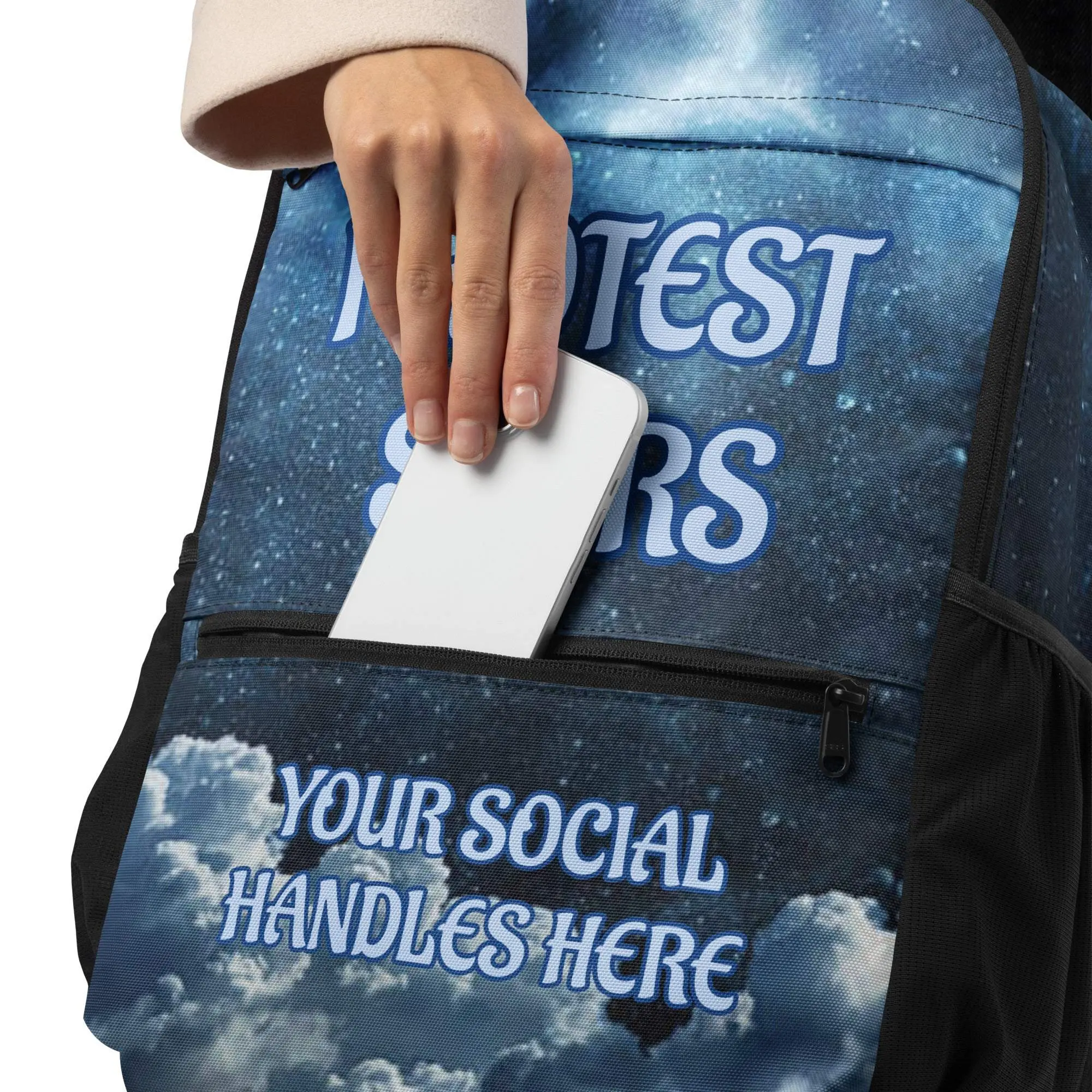 *Please select “add a note” to include your handle as personalized text or type “Blank” to remove personalization* Express your style with a backpack that’s equal parts trendy and practical. It provides spacious compartments, a secure laptop pocket, and a comfy fit to keep you ready for work, weekend trips, and last-minute adventures. • 100% polyester • Fabric weight: 9.73 oz./yd.² (330 g/m²) • Capacity: 4.3 gallons (16.1 l) • Maximum weight limit: 11.02 lbs (5 kg) • Spacious main compartment with multiple pockets • 2 front pockets • Mesh pockets on both sides • Hidden back pocket • Zippered laptop pocket • Adjustable straps • Blank product sourced from China Age restrictions: For adults EU Warranty: 2 years In compliance with the General Product Safety Regulation (GPSR), Protest Stars and Printful ensure that all consumer products offered are safe and meet EU standards. For any product safety related inquiries or concerns, please contact our EU representative at Support@printful.com. You can also write to us at Personal Orders 217 Wrangler Drive Coppell, Texas 75019 United States or Lidostas parks, Marupes novads, Latvia LV-2167.