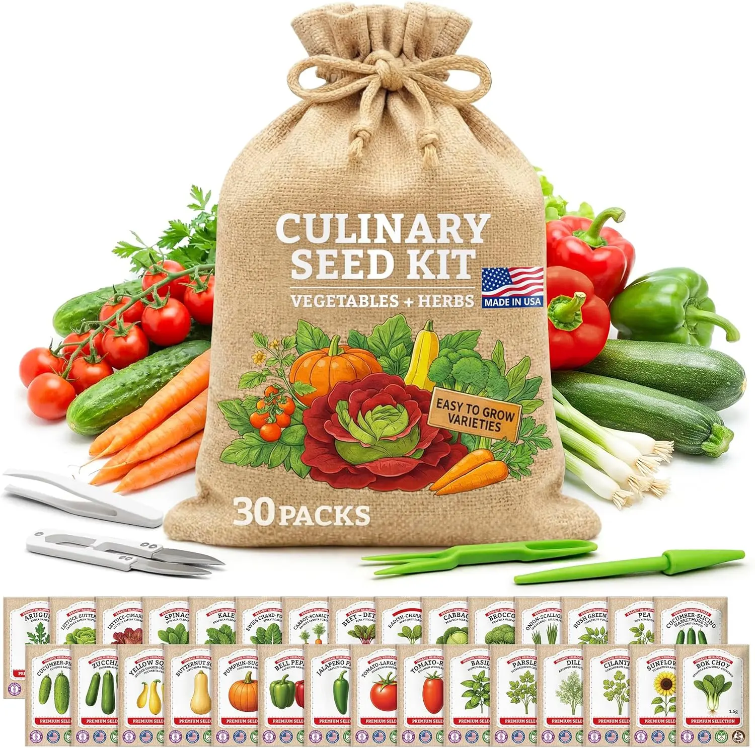 Culinary Vegetable & Herb Seeds Variety Pack - 30 Heirloom Non-GMO Garden Seeds for Planting, Seed Kit with Tools, Made in USA