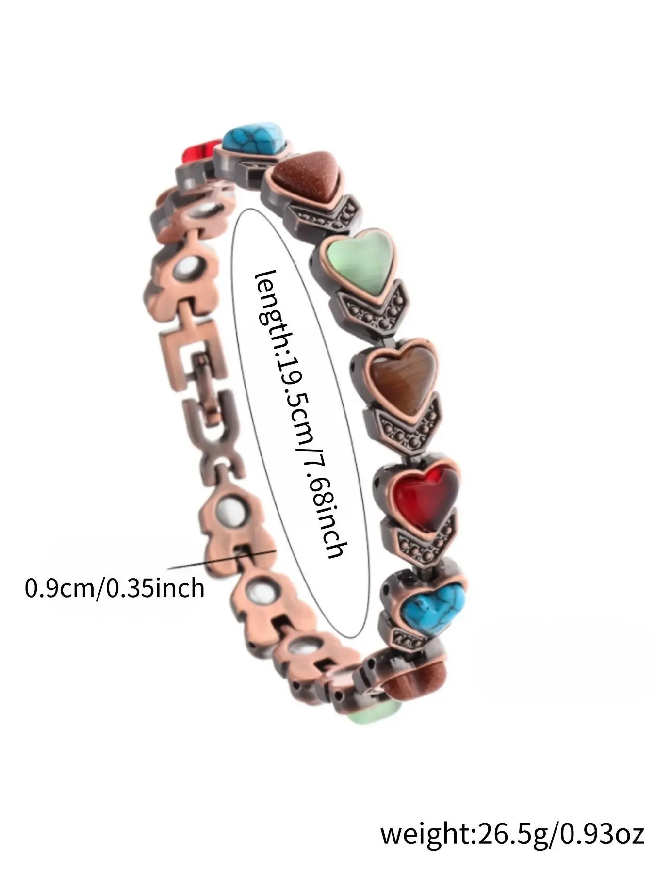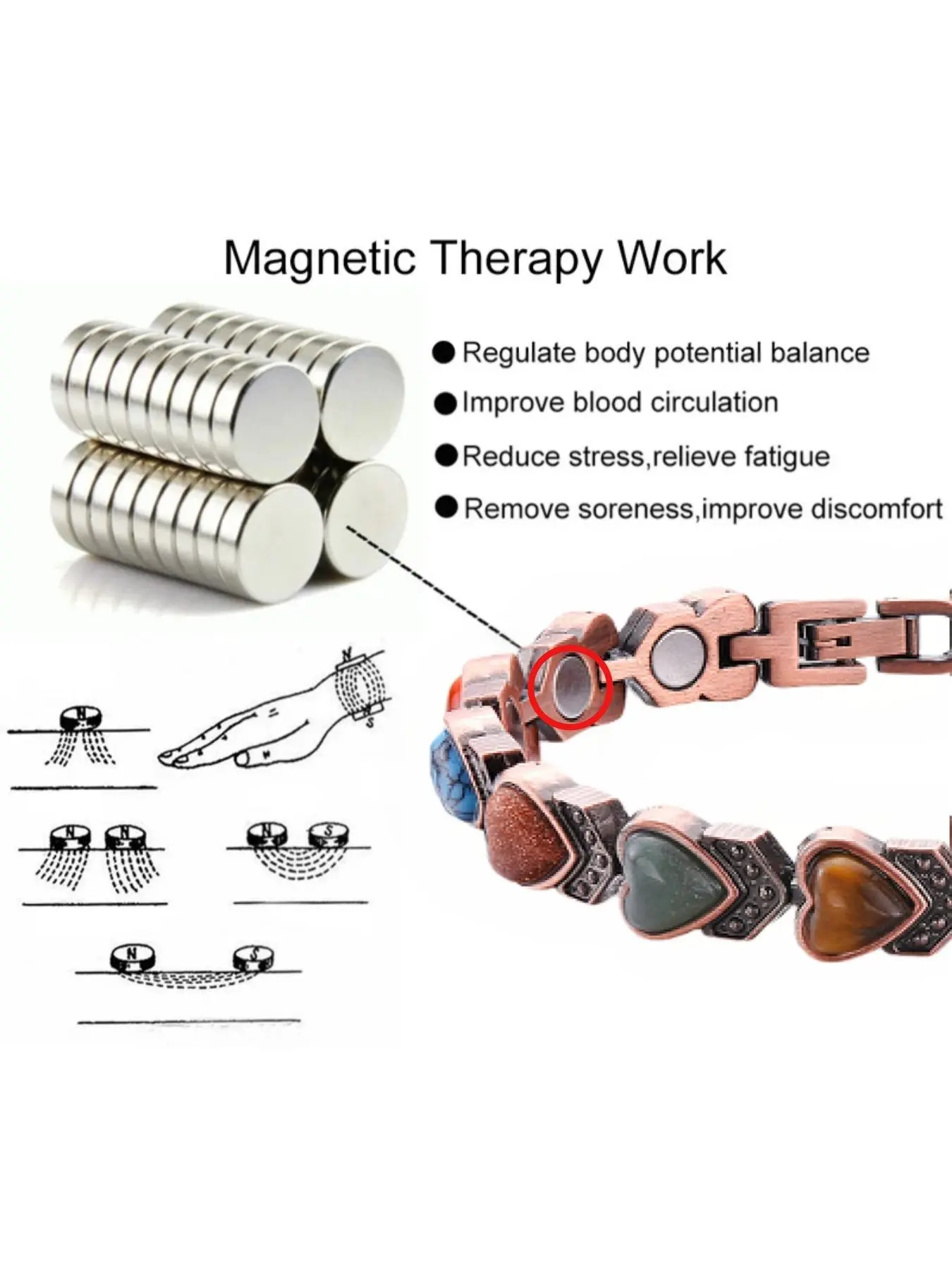 Vintage Magnetic Therapy Bracelet for Women, Couple Sleep Aid Wristband, Solid Copper, Multicolor Stones, Fashion Retro Jewelry