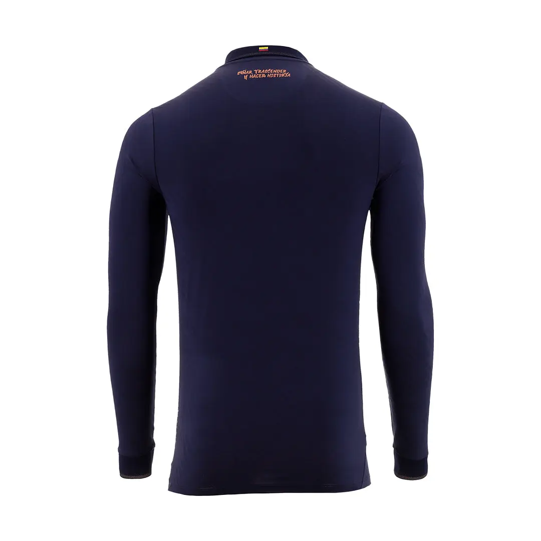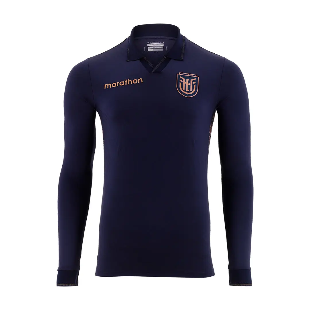 Represent the strength and elegance of the Tricolor with the Official 2026 Away 1 Men's Long Sleeve Jersey. This sophisticated navy blue edition features rose-gold accents and a refined polo-style collar, representing the next evolution of the Ecuadorian identity for international play. Designed for those who demand a bold, modern look with full coverage, this long-sleeve kit provides peak performance on and off the pitch.