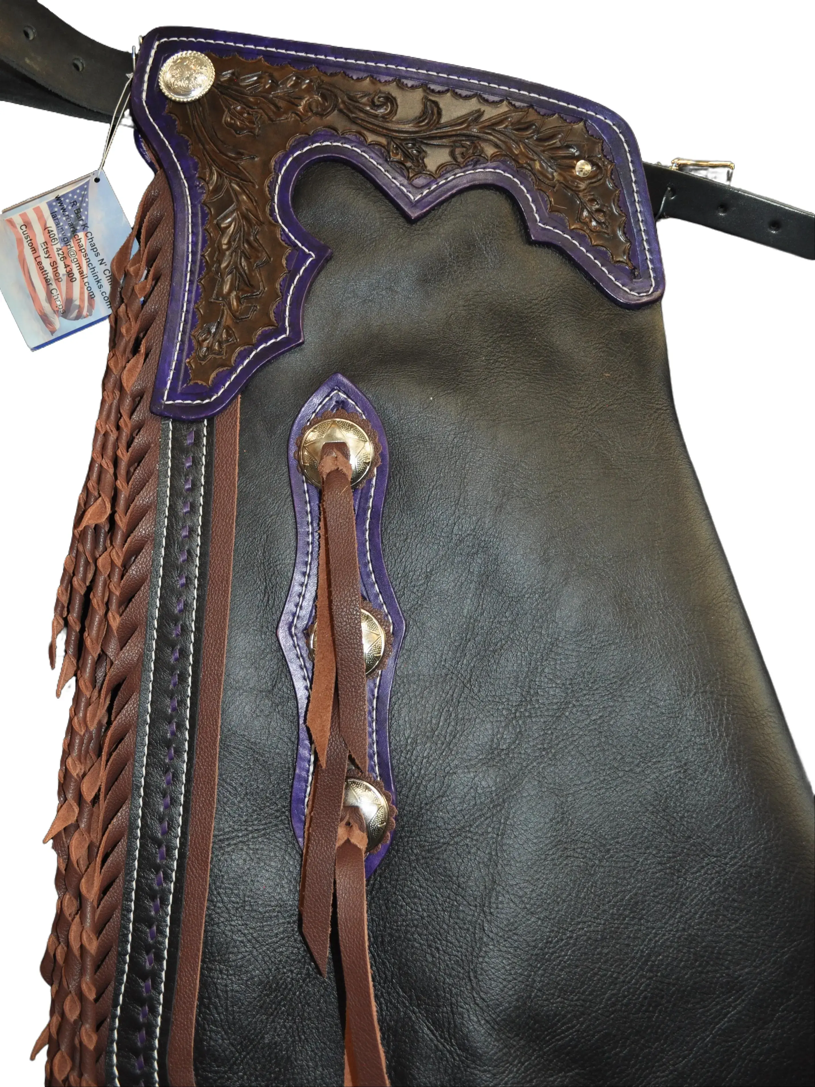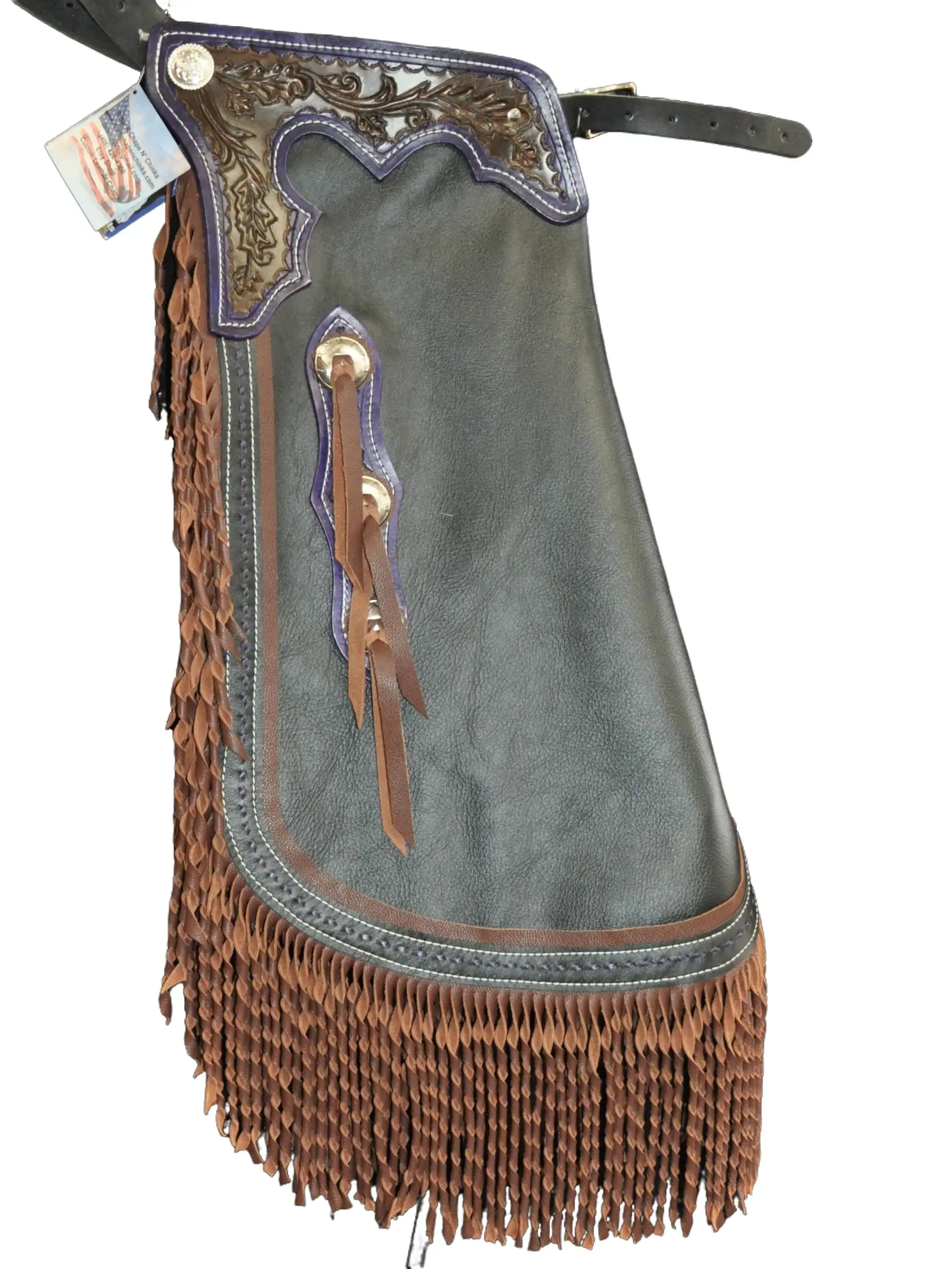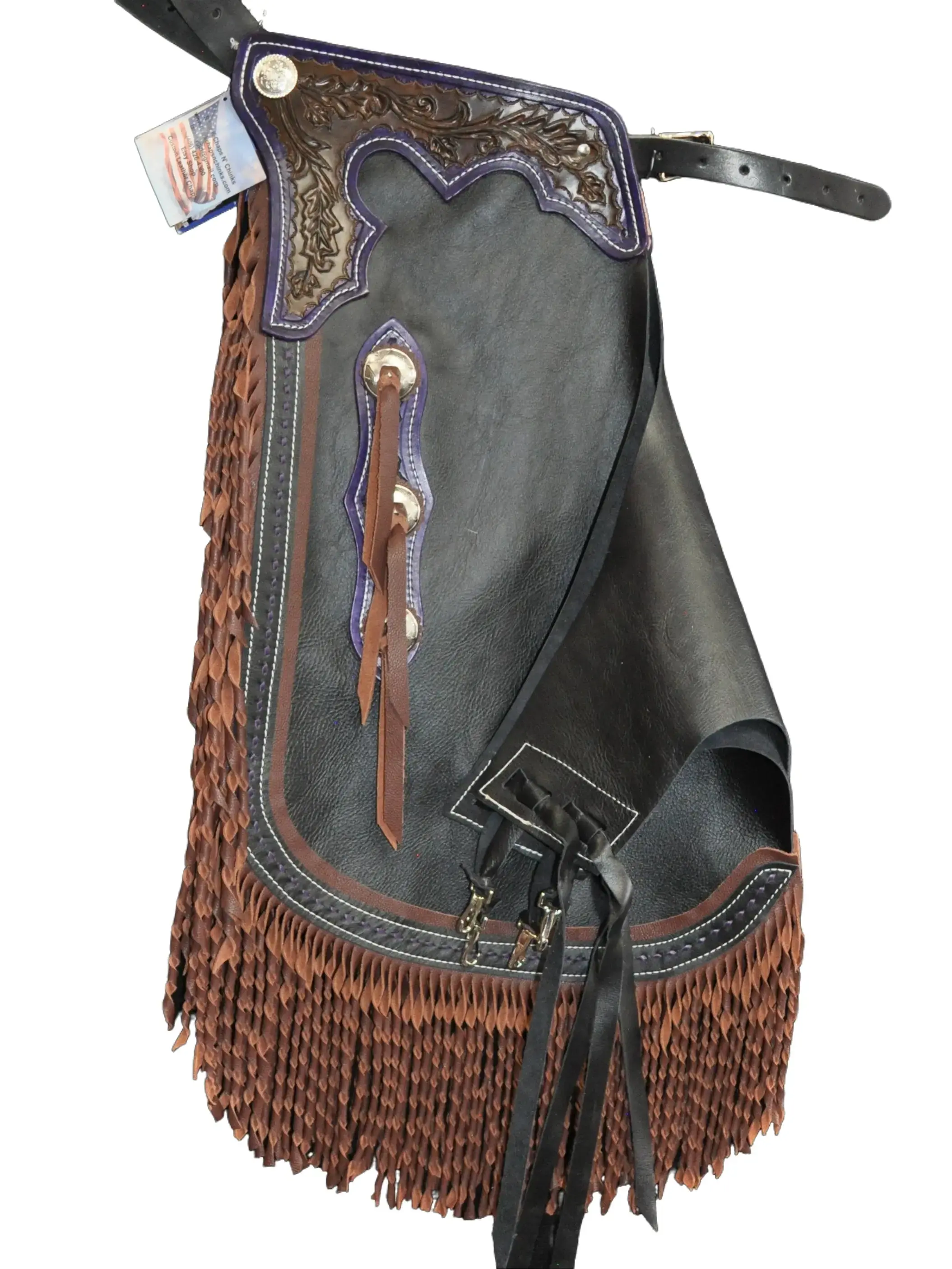 These chinks are made with a quality, black chap leather. They have 8 oz. tooling leather trim pieces, dyed a dark brown, with a leafy carved design on them and purple edging. There is 7" dark brown, two toned twisted fringe on the leg, bordered with purple buck stitching, and there are four metal conchos and two chap snaps on each leg as well. These chinks are a nice choice for work or show!