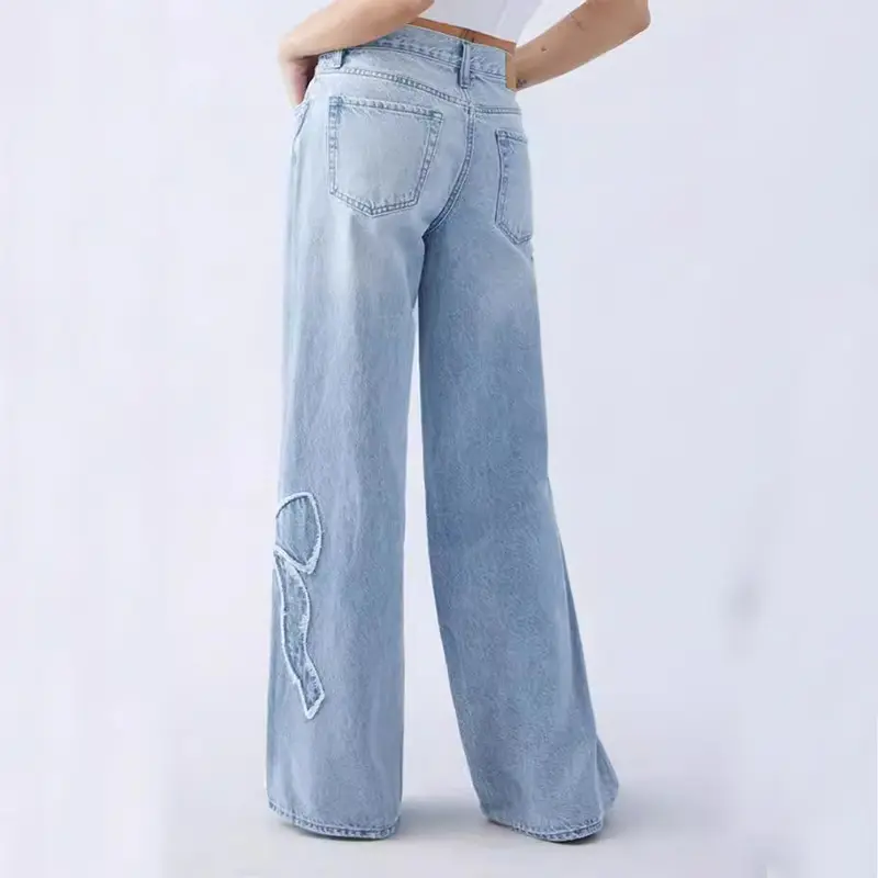 Women's Straight Trousers Embroidered Side Frayed Butterfly Jeans Street Design Hot Girl Baggy Pants