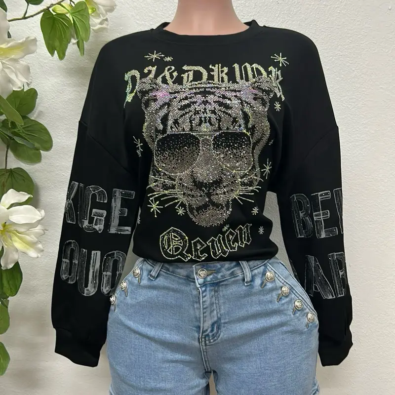 ·This sweatshirt combines style and comfort. The rhinestones and tiger design make it a versatile addition to your wardrobe. Stand out with this fashionable and distinctive piece.