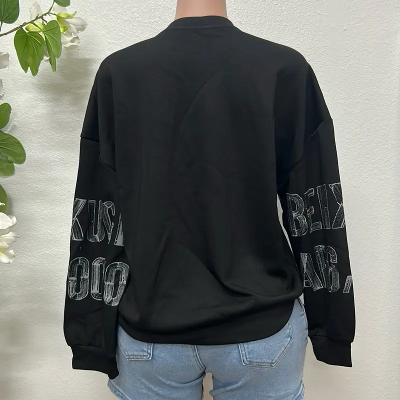 ·The sweatshirt is embellished with rhinestones, adding a touch of glamour. The tiger design and bold lettering make it a statement piece. Ideal for casual outings or themed events. The dark color base enhances the visibility of the embellishments.