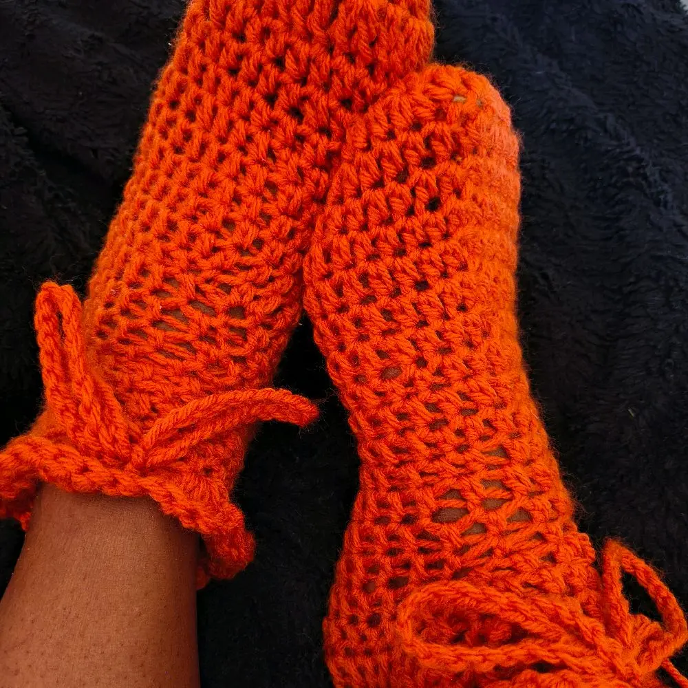 These orange crochet slippers are perfect for home use. They feature a charming bow detail that adds a touch of elegance. Ideal for relaxing at home, these slippers ensure comfort and style. 🏠