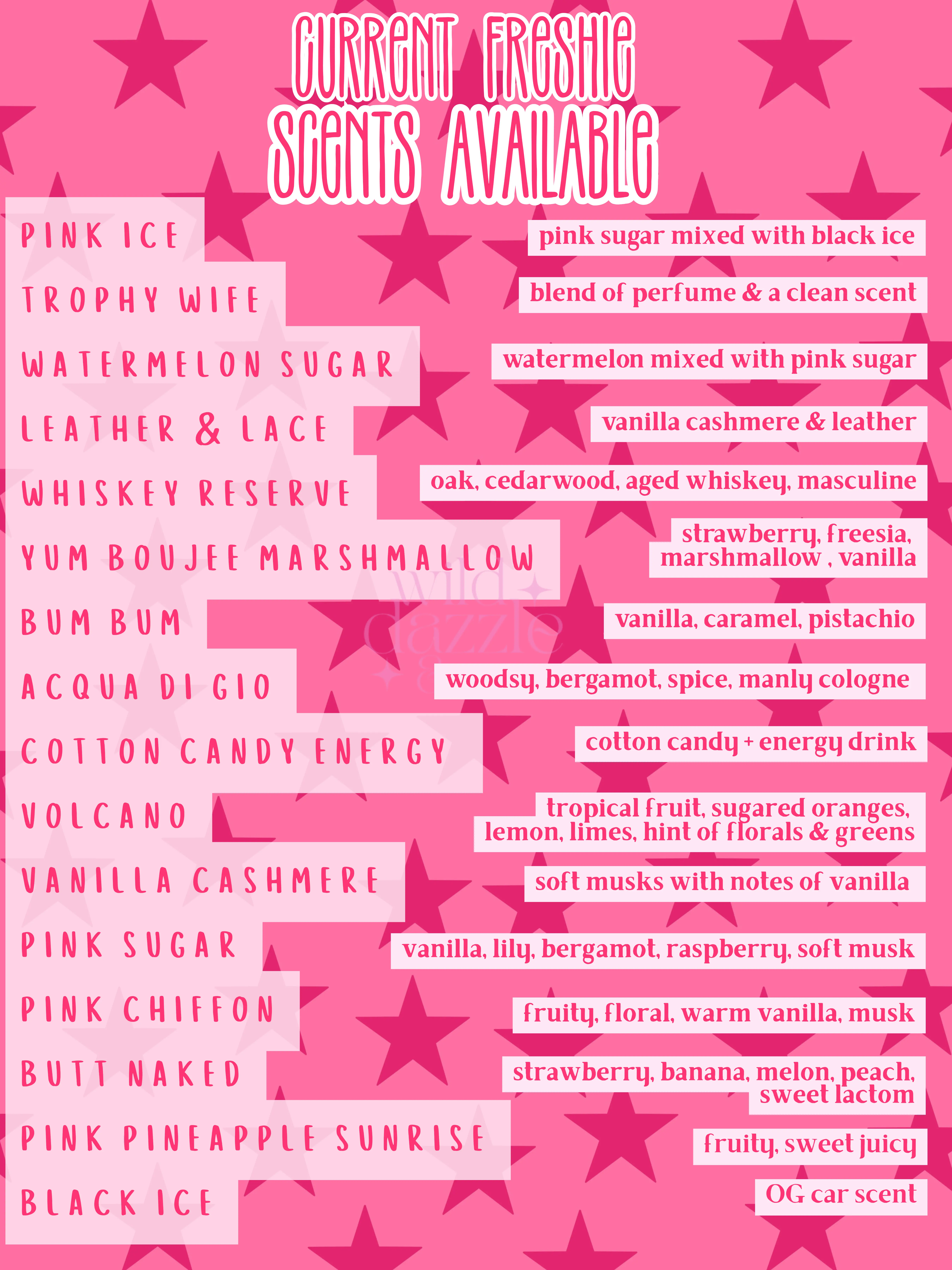 What is a freshie? It is an air freshener that you hang from your mirror in your car. They last 4-6 weeks! They are also great for small spaces, such as, closets, small rooms, gym bags, etc.