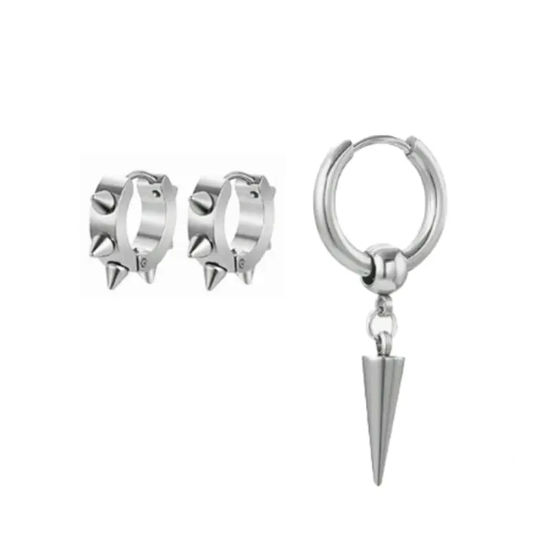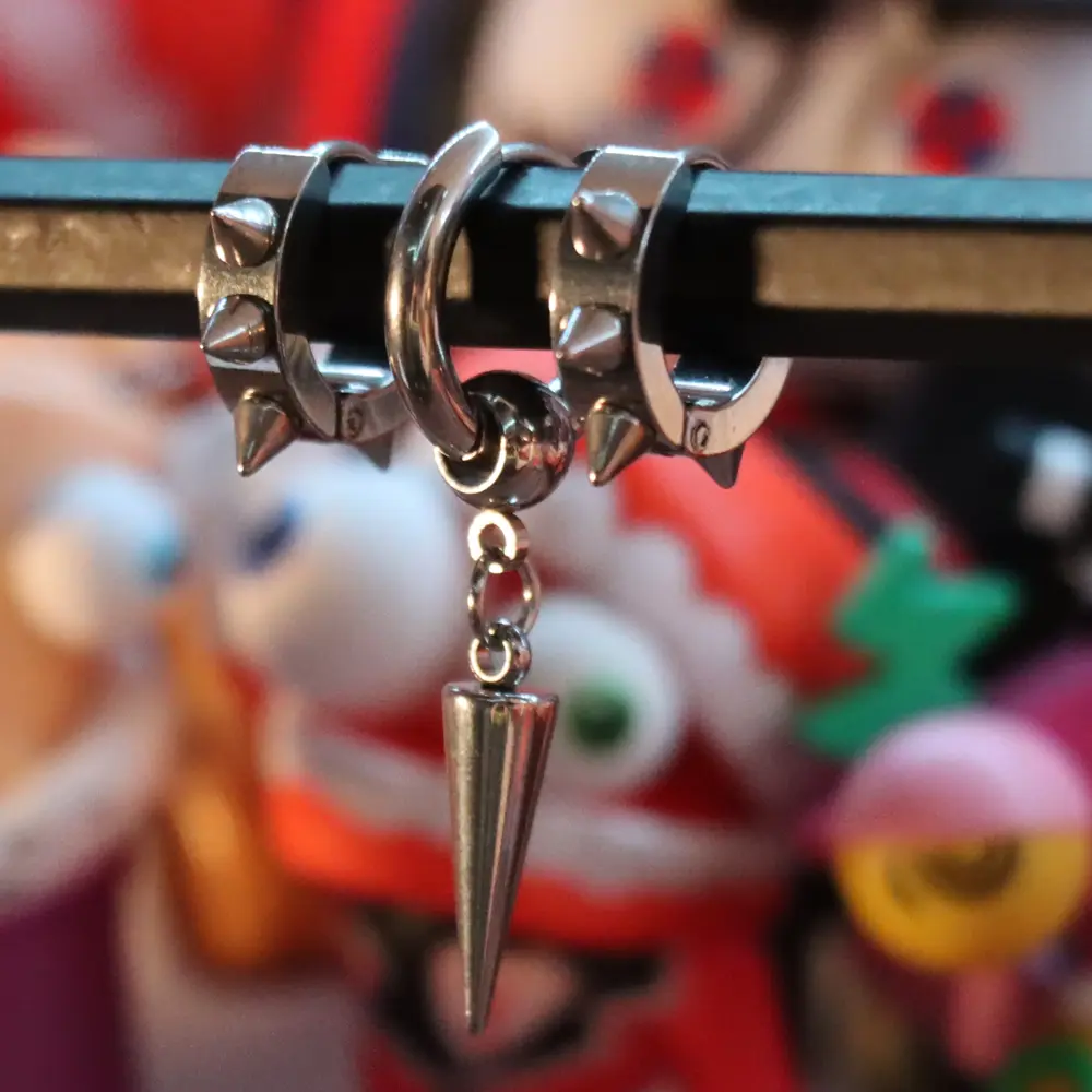 The spikey set includes three silver hoop earrings with a strong, modern and edgy aesthetic. It features two spiked‑style hoops and one smooth hoop with a dangling cone pendant. Lightweight, comfortable and perfect for daily wear, streetwear outfits or stacking with other accessories. A clean but aggressive accessory set that adds personality and presence to any style.