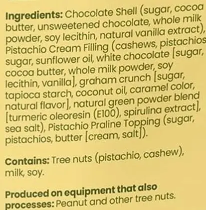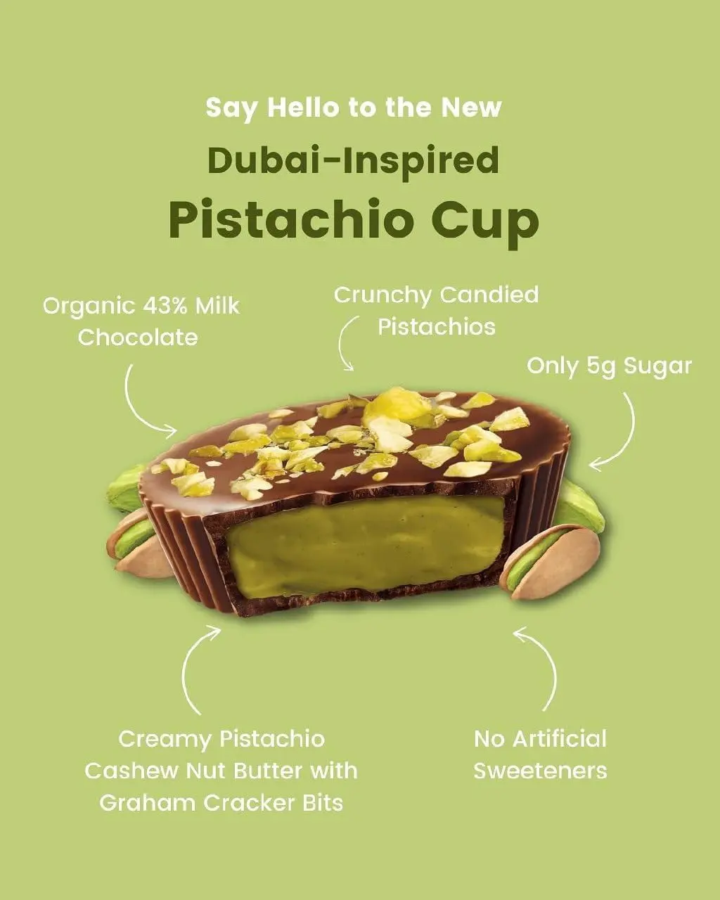 Enjoy the rich taste of Dubai-inspired chocolate with these Pistachio Cups. Made with smooth 43% milk chocolate and a creamy pistachio cashew filling, each bite offers a delightful balance. Silky chocolate, nutty pistachio, and crunchy graham cracker bits combine for a premium treat. Only 5g of sugar per cup, making it a lighter option. No artificial sweeteners or sugar alcohols. Certified gluten-free.