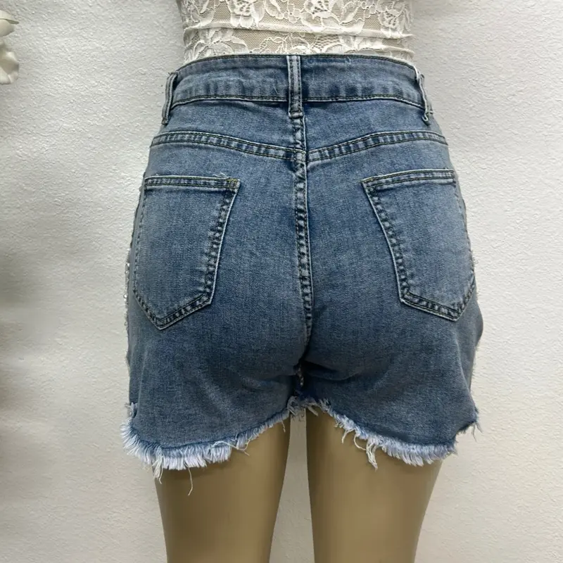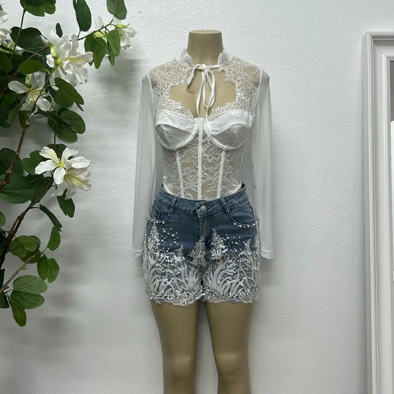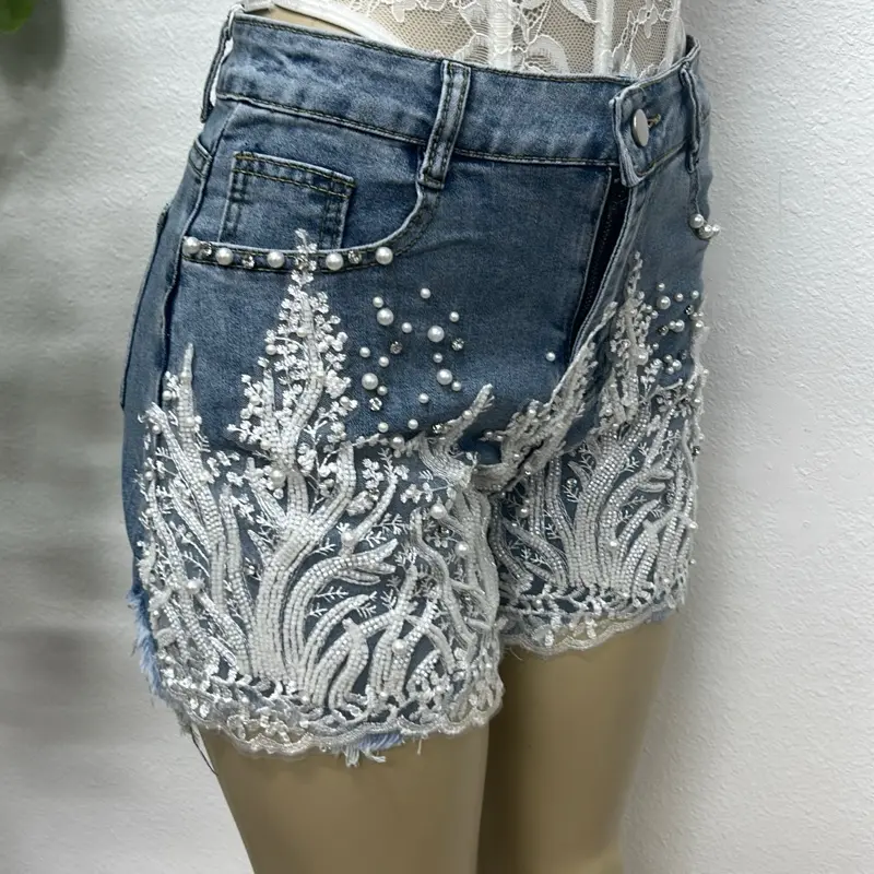 Elevate your wardrobe with this fashionable denim short. Perfect for women who love a touch of elegance, it features embroidered lace beads and pearls. This unique design adds a chic flair to any outfit. Ideal for casual outings or a stylish day look.