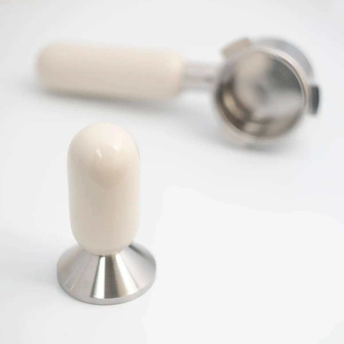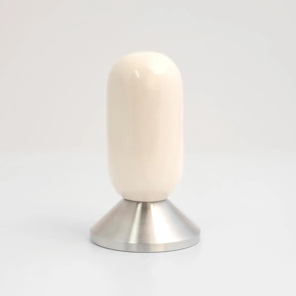 This tamp is crafted for morning rituals. No space age engineering here, just a handmade ceramic handle and a minimal form. This version is made with a bone white ceramic stoneware, with a glossy clear glaze. It pairs great with white and silver machines. We create a matching 54mm portafilter as well. (Portafilter not included)