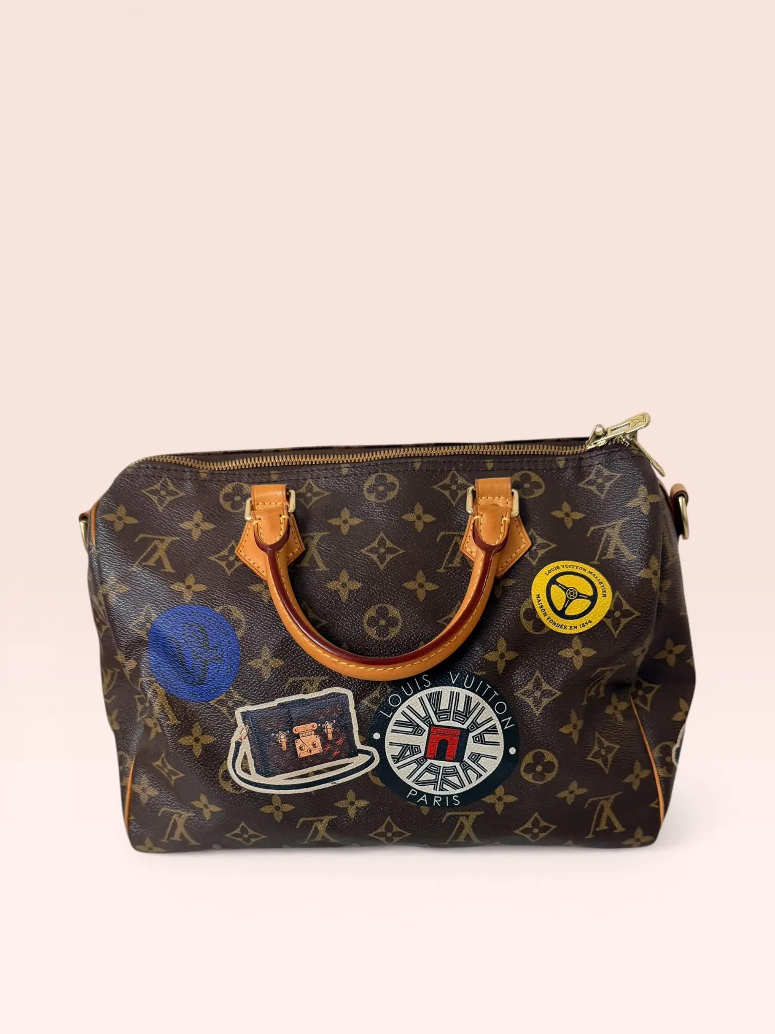 This pre-owned Louis Vuitton Monogram Speedy Bandoulière 30 is a rare piece from the World Tour Limited Edition 2016. It measures 11.8" x 8.3" x 6.7", making it a compact yet stylish accessory. Perfect for those who appreciate limited edition designs.