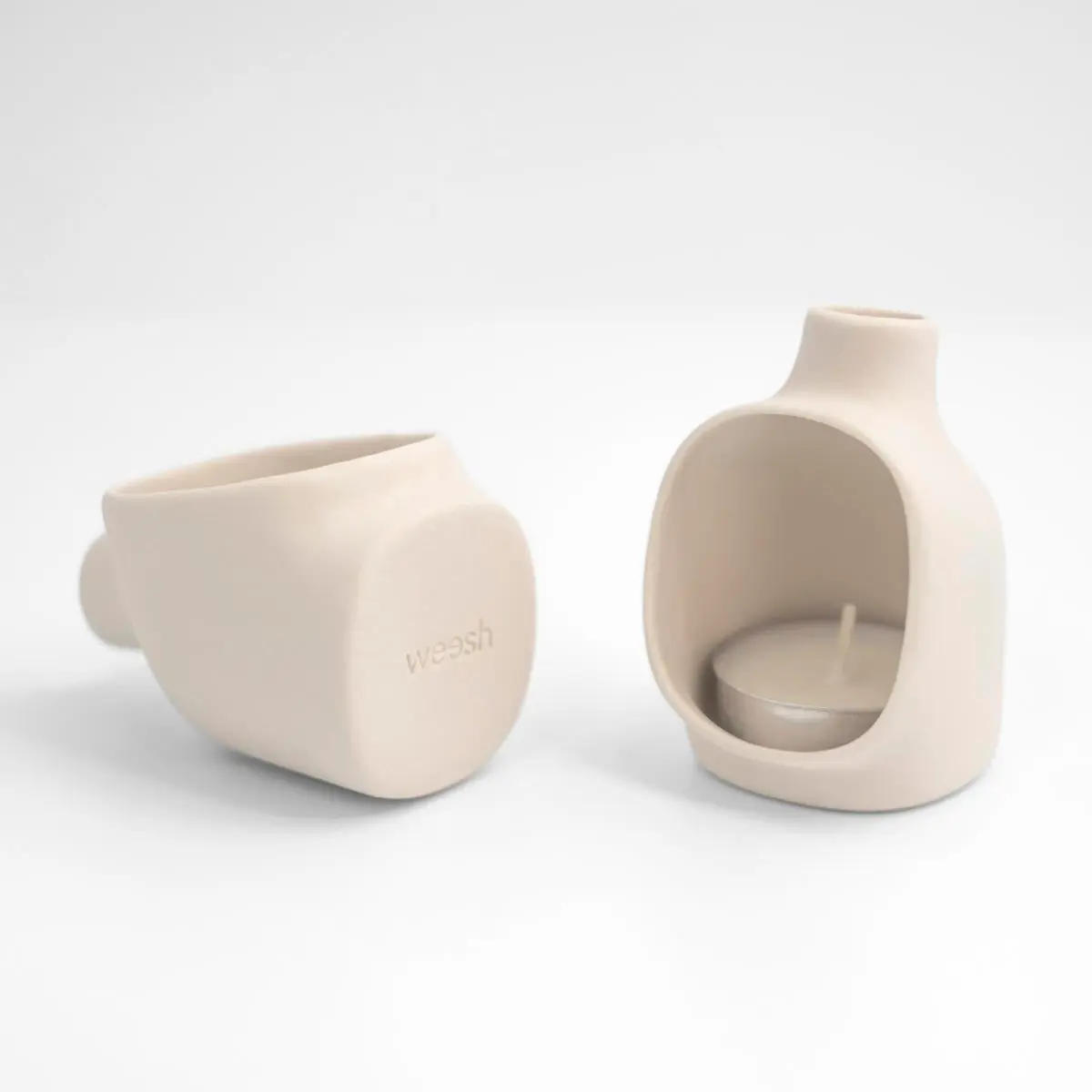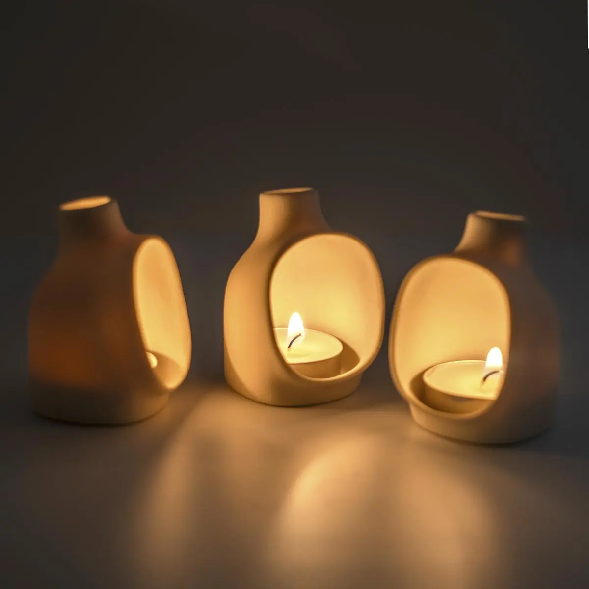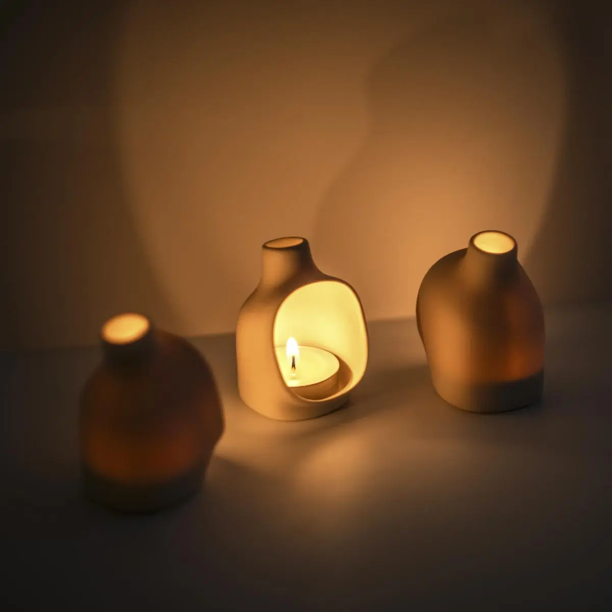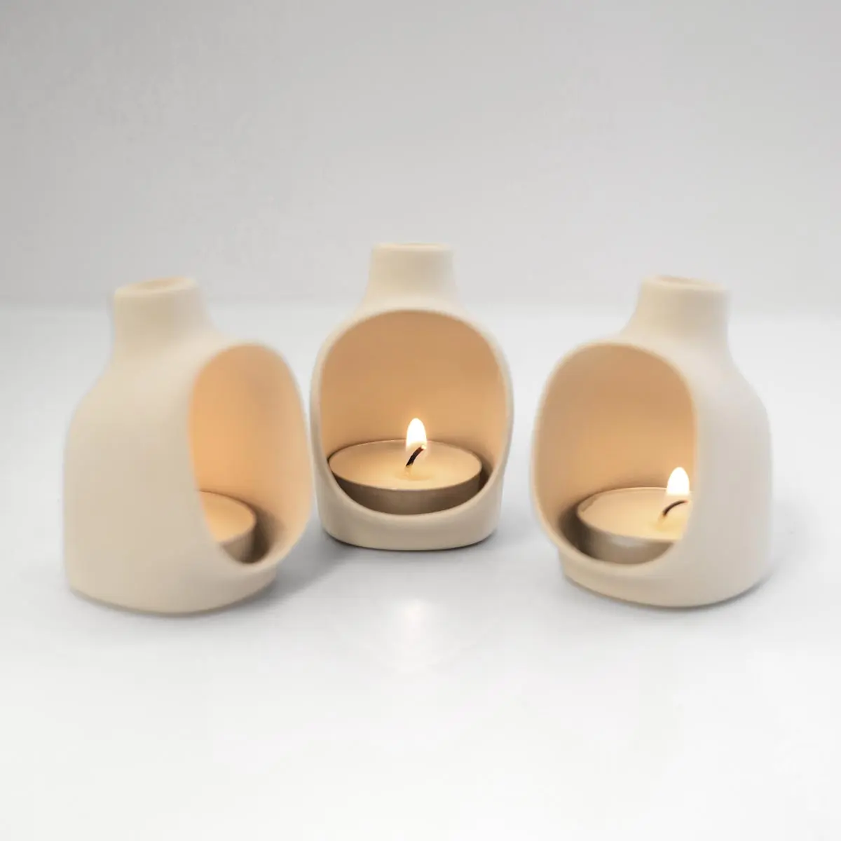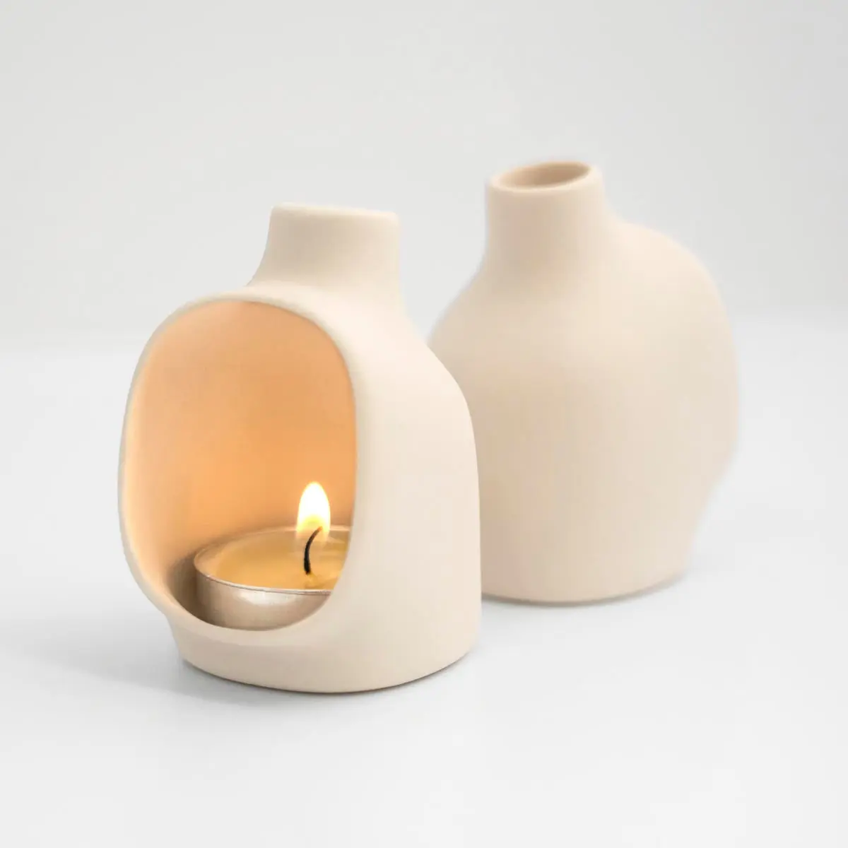 This handmade votive candle holder projects a soft cone of light out the front, like a tiny fireplace. Great for dim dinners, nightlights, and burning incense. Each flue is a handmade by Studio Weesh. It is perfectly sized to accommodate tea candles & cone incense. One tea candle is included with each holder. This version is made of a bone white ceramic to help reflect even more light.