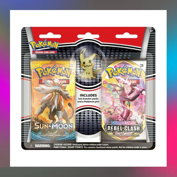 Each Blister contains two Pokemon TCG booster packs and 1 collectible pin. Each Pokémon TCG: Sword & Shield Series and Sun & Moon Series booster pack contains 10 cards and 1 basic Energy. Each Pokémon TCG: XY Series booster pack contains 10 cards. Booster packs may vary by product.