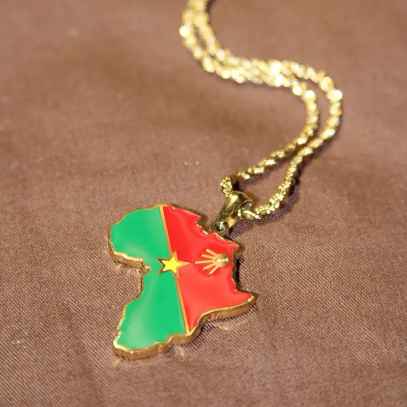 This pendant is a unique piece that captures the essence of Burkina Faso. It's a statement accessory that adds a touch of cultural flair to any outfit. The design is simple yet striking, making it a versatile addition to your jewelry collection. Perfect for those who appreciate distinctive pieces.