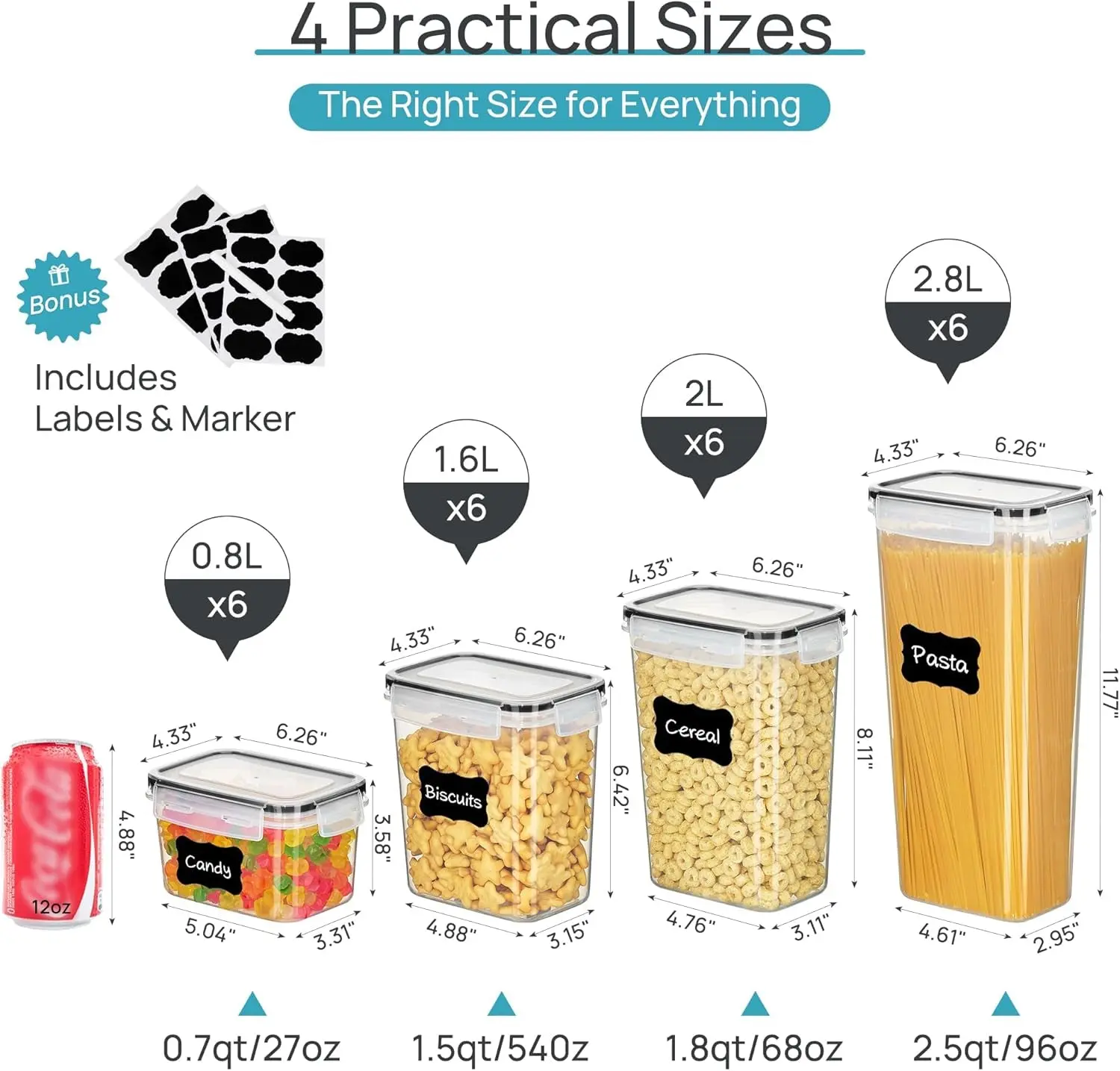 ·4 Size Combinations Fit Your Needs — Our kitchen storage container set comes in 4 different sizes. Including 6 Tall Containers (2.5quart/2.8 liters), 6 Large Containers (1.8quart/2.0 liters), 6 Medium Containers (1.5quart/1.6 liters), and 6 Small Containers (0.7quart/0.8 liters). Perfect for storing spaghetti, baking supplies, cereal, flour, sugar, oats, pasta, rice, coffee, tea, snacks, nuts and other dry goods.