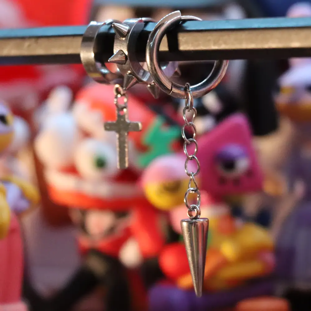 The tuff set includes three silver hoop earrings with a bold, edgy and modern aesthetic. It features one hoop with a dangling cross, one spiked hoop, and one hoop with a hanging cone pendant. Lightweight, comfortable and perfect for daily wear, streetwear outfits or stacking with other accessories. A clean but aggressive accessory trio that adds attitude and presence to any style.