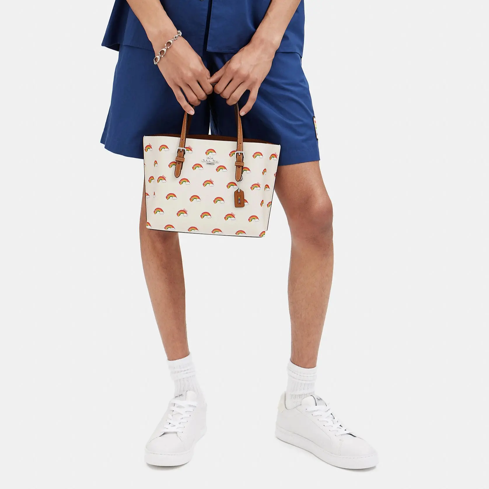 Materials: Exterior: 100% cotton canvas (rainbow print) + genuine cowhide leather trim and base. Lining: 100% polyester twill with COACH branding.