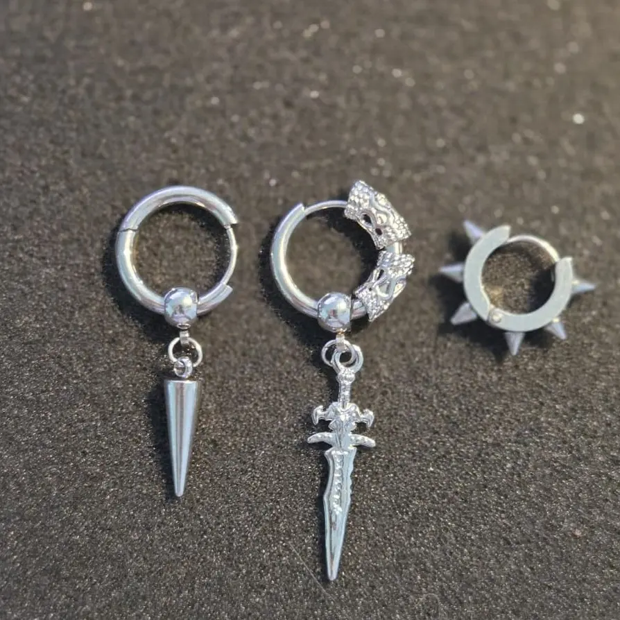 The tuff set B includes three silver hoop earrings with a bold, edgy and modern aesthetic. It features one spiked hoop, one textured hoop with a detailed dagger pendant, and one smooth hoop with a hanging cone pendant. Lightweight, comfortable and perfect for daily wear, streetwear outfits or stacking with other accessories. A clean but aggressive accessory trio that adds attitude, presence and a distinctive TUFF vibe to any style.